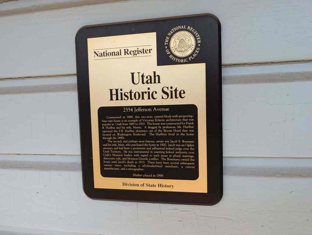 The second, and perhaps most famous, owner was Jacob S. Boreman and his wife, Mary, who purchased the home in 1900. Jacob was an Ogden attorney and had been a prominent and influential federal judge over the Utah Territory. He was instrumental in asserting federal authority over Utah’s Mormon leaders with regard to such issues as plural marriage, theocratic rule, and Mormon-Gentile conflict. The Boremans owned the house until Jacob’s death in 1913. There have been several subsequent owners since, including a wholesale/retail merchant, a manufacturer, and a stenographer.