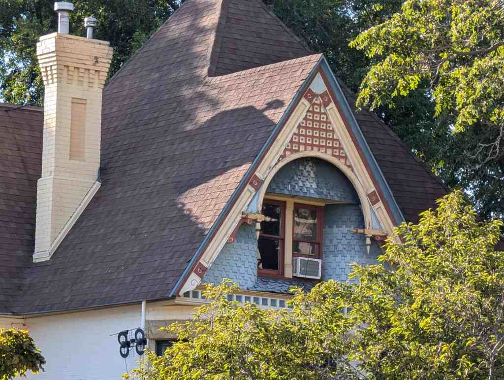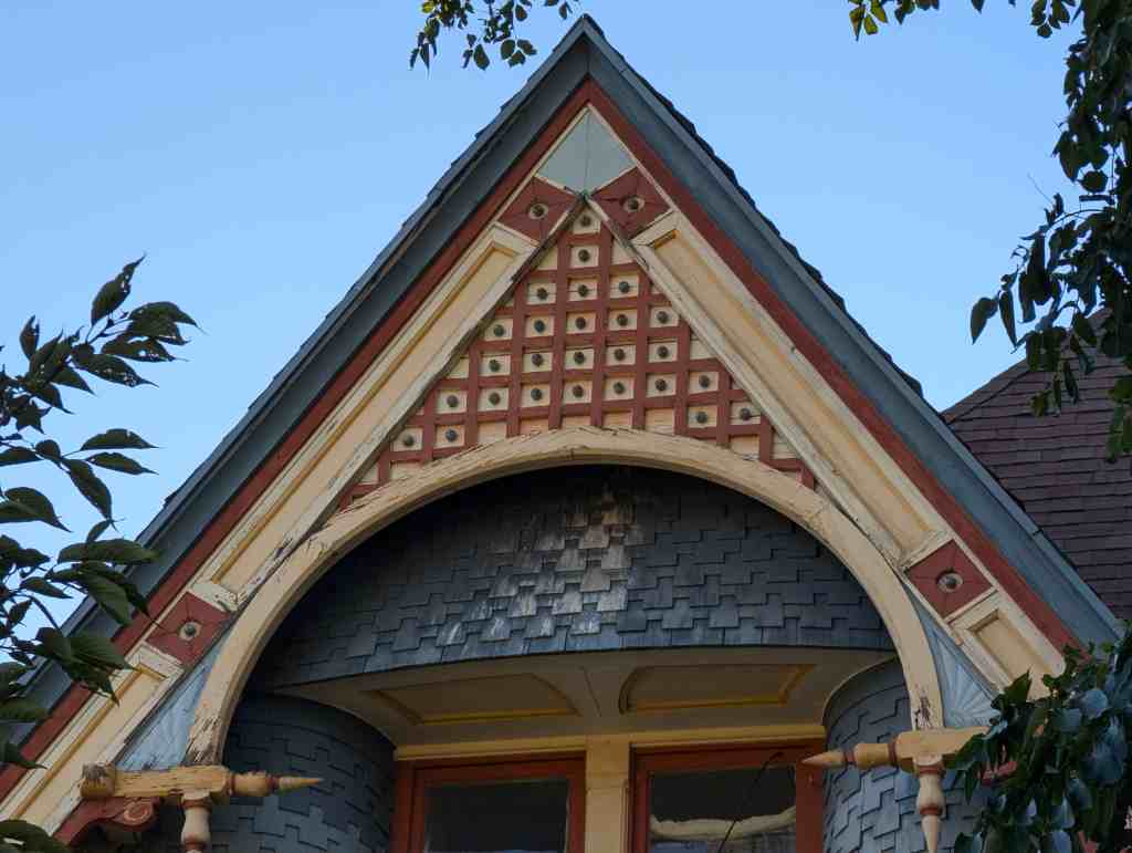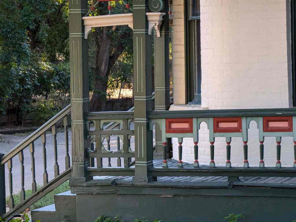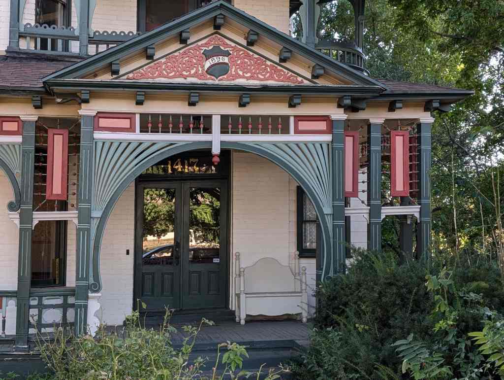 The doors of this three-story Queen Anne house are noticeably crooked, and the sill is uneven; according to local stories, this “flaw” and curved interior walls were designed to confuse harmful spirits.
