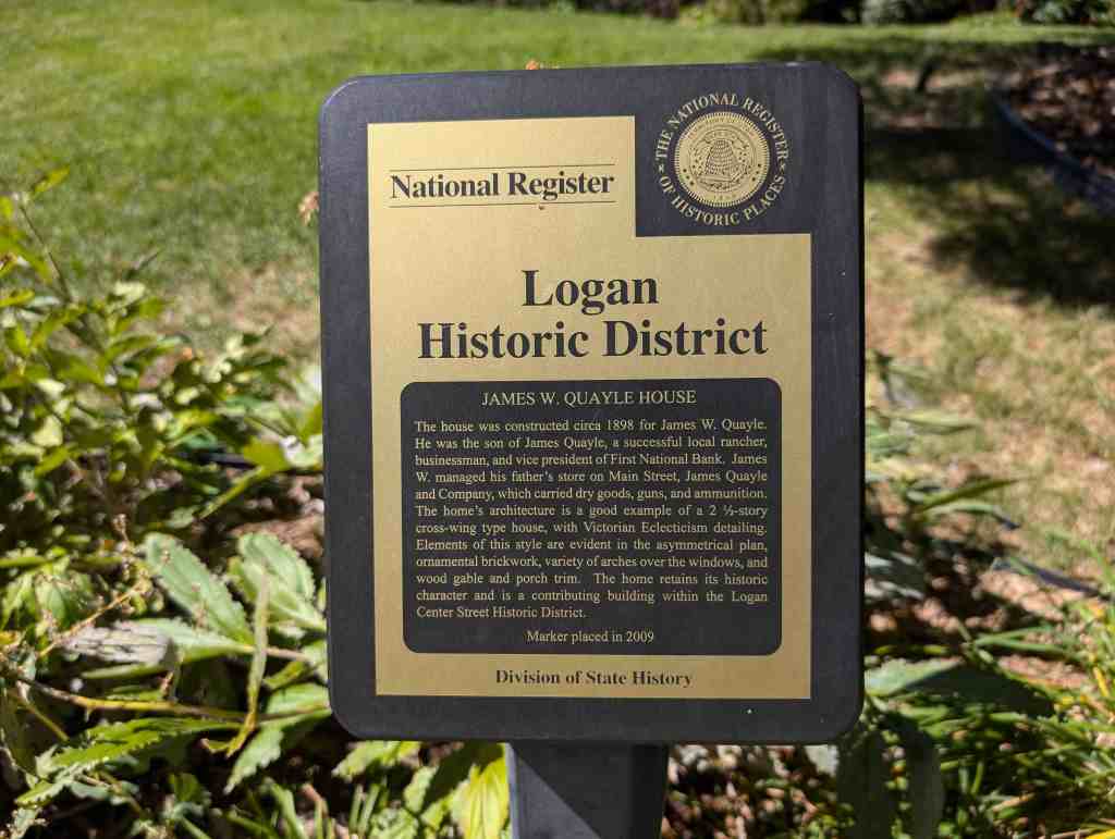 The house was constructed circa 1898 for James W. Quayle. He was the son of James Quayle, a successful local rancher, businessman, and vice president of First National Bank. James W. managed his father’s store on Main Street, James Quayle and Company, which carried dry goods, guns, and ammunition. The home’s architecture is a good example of a 2 1⁄2-story cross-wing type house, with Victorian Eclecticism detailing. Elements of this style are evident in the asymmetrical plan, ornamental brickwork, variety of arches over the windows, and wood gable and porch trim. The home retains its historic character and is a contributing building within the Logan Center Street Historic District.