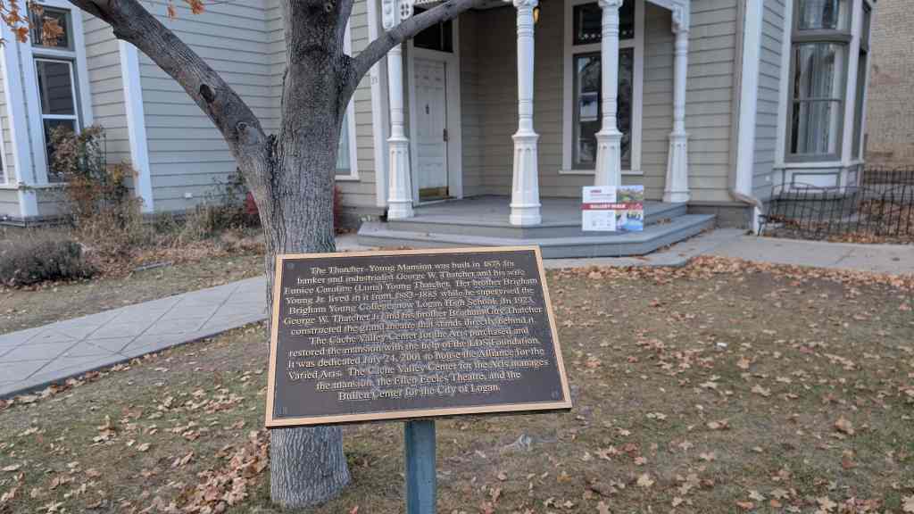 The Thatcher-Young Mansion was built in 1878 for banker and industrialist George W. Thatcher and his wife Eunice Caroline (Luna) Young Thatcher. Her brother Brigham Young Jr. lived in it from 1883-1885 while he supervised the Brigham Young College, now Logan High School. In 1923, George W. Thatcher Jr. and his brother Brigham Guy Thatcher constructed the grand theatre that stands directly behind it. The Cache Valley Center for the Arts purchased and restored the mansion with the help of the LDS Foundation. It was dedicated July 24, 2001 to house the Alliance for the Varied Arts. The Cache Valley Center for the Arts manages the mansion, the Ellen Eccles Theatre, and the Bullen Center for the City of Logan.
