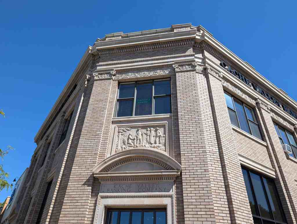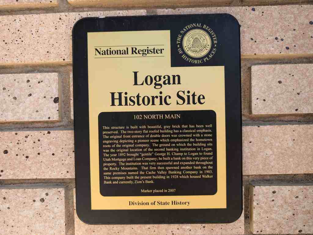 This structure is built with beautiful, gray brick that has been well preserved. The two-story flat roofed building has a classical emphasis. The original front entrance of double doors was crowned with a stone engraving depicting a pioneer scene which emphasized the hometown roots of the original company. The ground on which the building sits was the original location of the second banking institution in Logan. The year 1892 brought “gentile” George H. Champ to Logan to found Utah Mortgage and Loan Company; he built a bank on this very piece of property. The institution was very successful and expanded throughout the Rocky Mountains. That firm then spawned another bank on the same premises named the Cache Valley Banking Company in 1903. This company built the present building in 1928 which housed Walker Bank and currently, Zion’s Bank.
