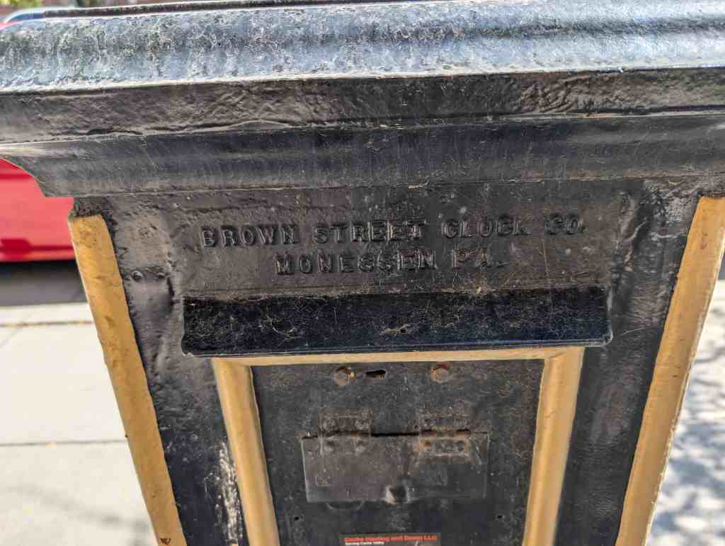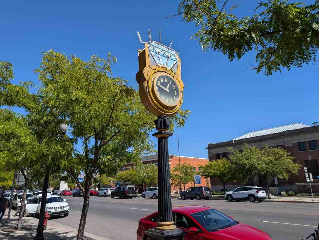S.E. Needham Jewelers was established in 1896 and is believed to be the oldest jewelry store in Utah. In the 1910s or 1920s, the store had street clock installed from Brown Street Clock. In 1935, the neon panels representing a diamond ring were added around the clock. The clock face is illuminated with a neon ring inside the glass cover. There was also a neon text panel with the business name and an arrow pointing at the store. That sign was hit by a truck and removed in the 1950s. A modern, four-faced reproduction street clock was added at Needham’s back entrance in 2008.*