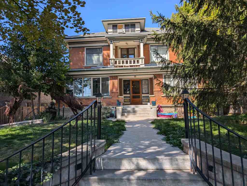 Marriner S. Eccles, the eldest child of David and Ellen Eccles, built this 2½-story home in 1913. Carl Schaub designed the home. Architectural styles include Spanish Revival, Classical, Italianate, and Prairie. The arched front porch and the arbor to the south dominate the façade.