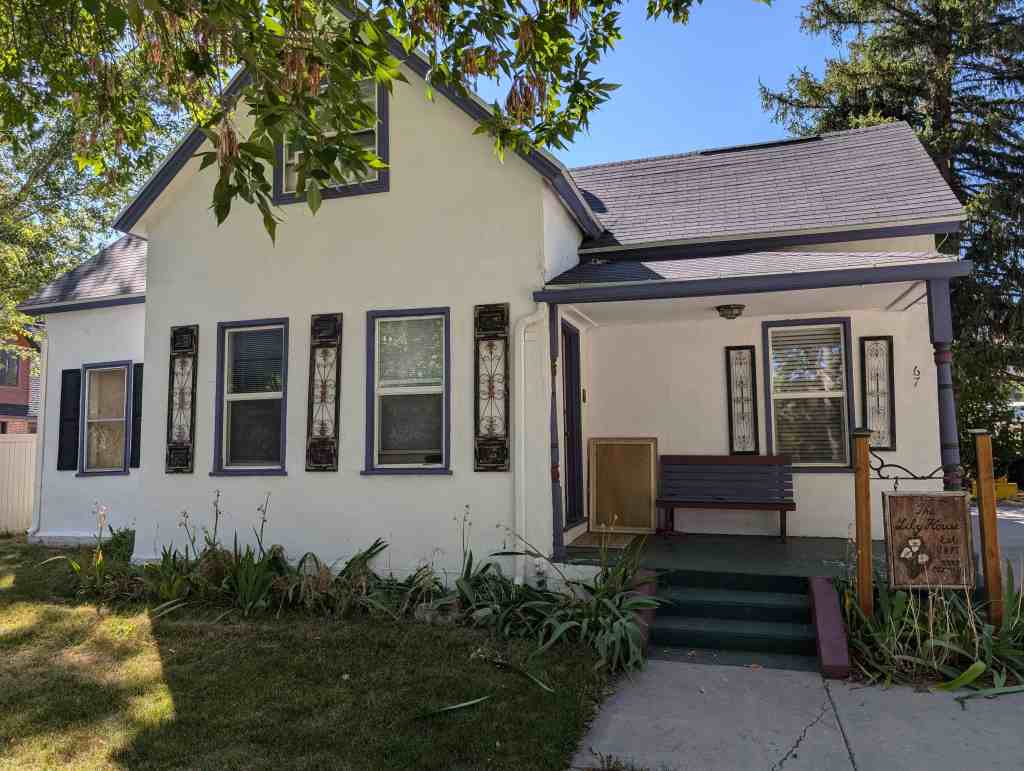 Located on the Isom lot at 83 North State Street and initially intended as a granary to store feed for farm animals, it originally served as “home” to Lewis and Mary Crawford. Their first child, a girl, was born here. Lewis worked for the Canal Company as a “ditch” rider to watch for breaks in the canal or other potential problems.