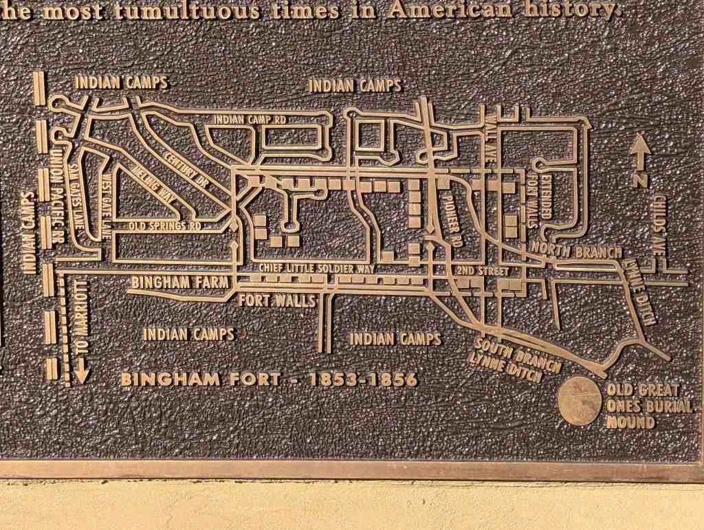 But elsewhere the uneasy peace crumbled, and in 1853 Mormon leader Brigham Young ordered settlers to build and move into forts. for security. Bingham Fort was right here. With 560 residents, was the most populous on the Wasatch Front. But locals were slow to construct its walls and gates; a sign that here, the people were not in conflict. In fact, during winter of 1854-1855, destitute Chief Little Soldier and his band moved into Bingham Fort to share the settlers food.