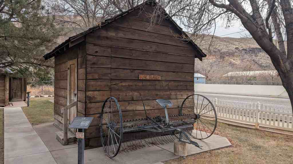 The pioneer hay barn, manger, and corral you see before you were reconstructed using material from three earlier pioneer barns, primarily the Sheldon Wright barn. Some posts and boards for these structures came from the Rulan Isom and Bernard Hinton barns. Members of the Hurricane Chapter of the Sons of Utah Pioneers were the primary builders of this reconstructed pioneer barn. The cement water trough came from the original Lafe Hall town lot at 65 North Main Street. A date inscribed on one side of the cement shows that it was made August 28, 1918.