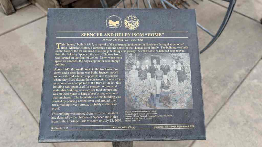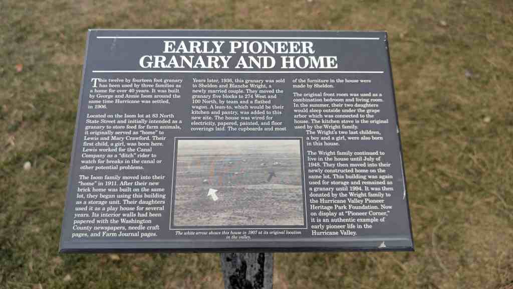 The Wright family continued to live in the house until July of 1948. They then moved into their newly constructed home on the same lot. This building was again used for storage and remained as a granary until 1994. It was then donated by the Wright family to the Hurricane Valley Pioneer Heritage Park Foundation. Now on display at “Pioneer Corner,” it is an authentic example of early pioneer life in the Hurricane Valley.