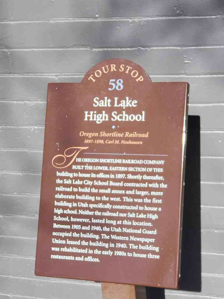 The Oregon Shortline Railroad Company built the lower, eastern section of this building to house its offices in 1897. Shortly thereafter, the Salt Lake City School Board contracted with the railroad to build the small annex and larger, more elaborate building to the west. This was the first building in Utah specifically constructed to house a high school. Neither the railroad nor Salt Lake High School, however, lasted long at this location.