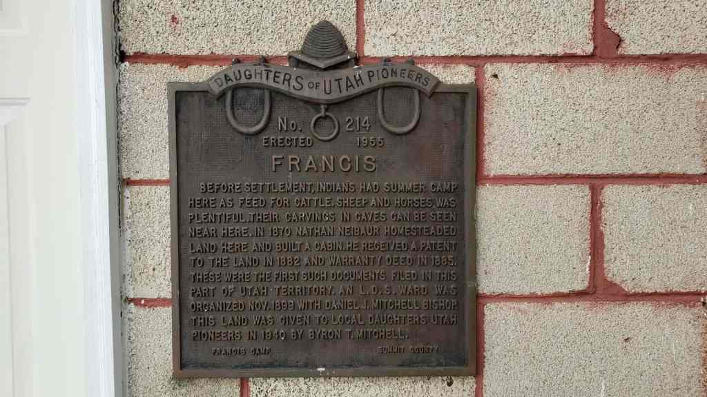 This historic marker (D.U.P. Marker #214) is located on the Daughters of Utah Pioneers Museum located at 52 West 2200 South in Francis, Utah.