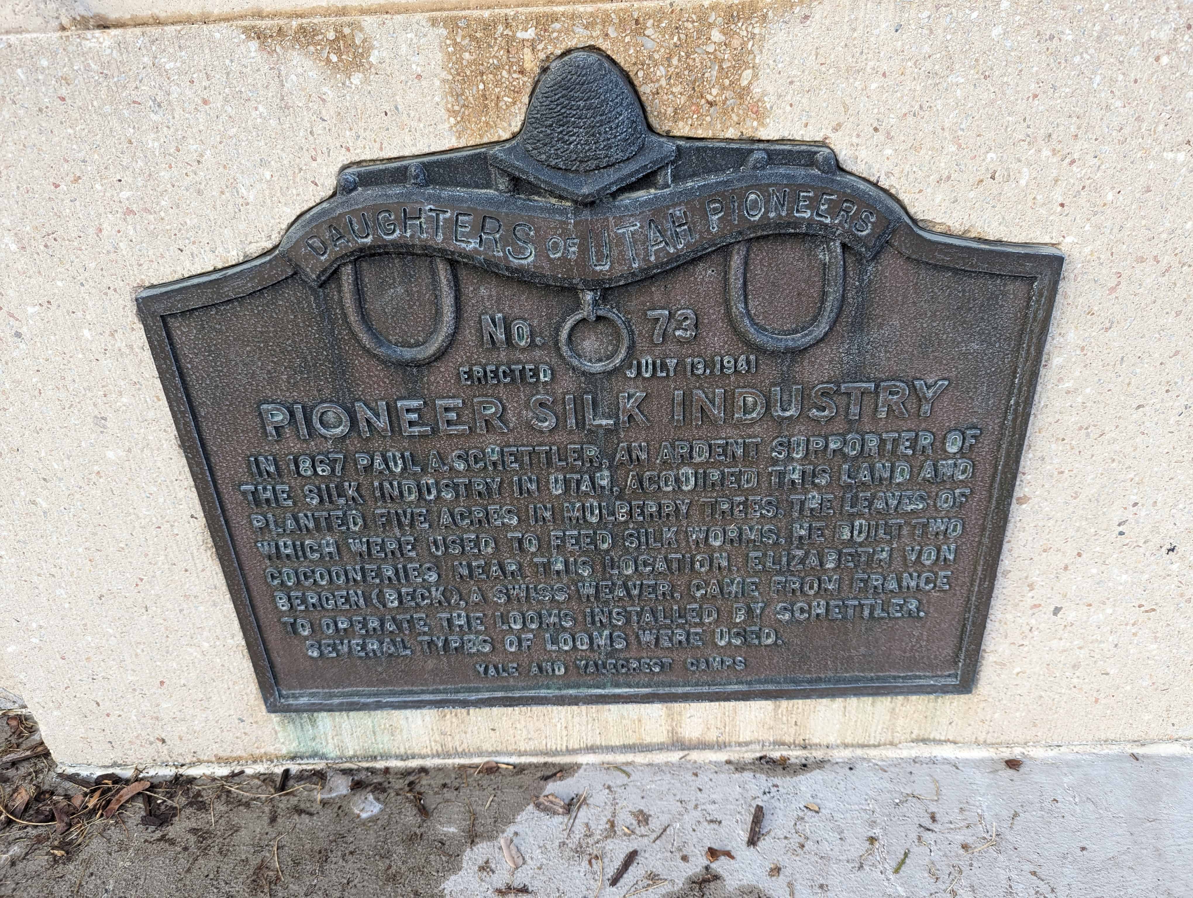 In 1867 Paul A. Schettler, an ardent supporter of the silk industry in Utah, acquired this land and planted five acres in mulberry trees, the leaves of which were used to feed silk worms. He built two cocooneries near this location. Elizabeth Von Bergen (Beck), a Swiss weaver, came from France to operate the looms installed by Schettler. Several types of looms were used.