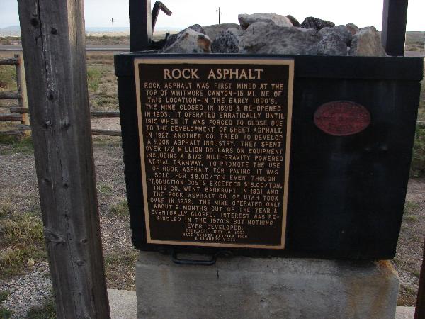 Rock asphalt was first mined at the top of Whitmore Canyon – 15 mi. NE of this location – in the early 1890’s. The mine closed in 1898 & re-opened in 1903. It operated erratically until 1915 when it was forced to close due to the development of sheet asphalt. In 1927 another Co. tried to develop a rock asphalt industry. They spent over 1/2 million dollars on equipment including a 3 1/2 mile gravity powered aerial tramway. To promote the use of rock asphalt for paving, it was sold for $8.00/ton even though production costs exceeded $16.00/ton. The Rock Asphalt Co. of Utah took over in 1932. The mine operated only about 2 months out of the year & eventually closed. Interest was rekindled in the 1970’s but nothing ever developed.