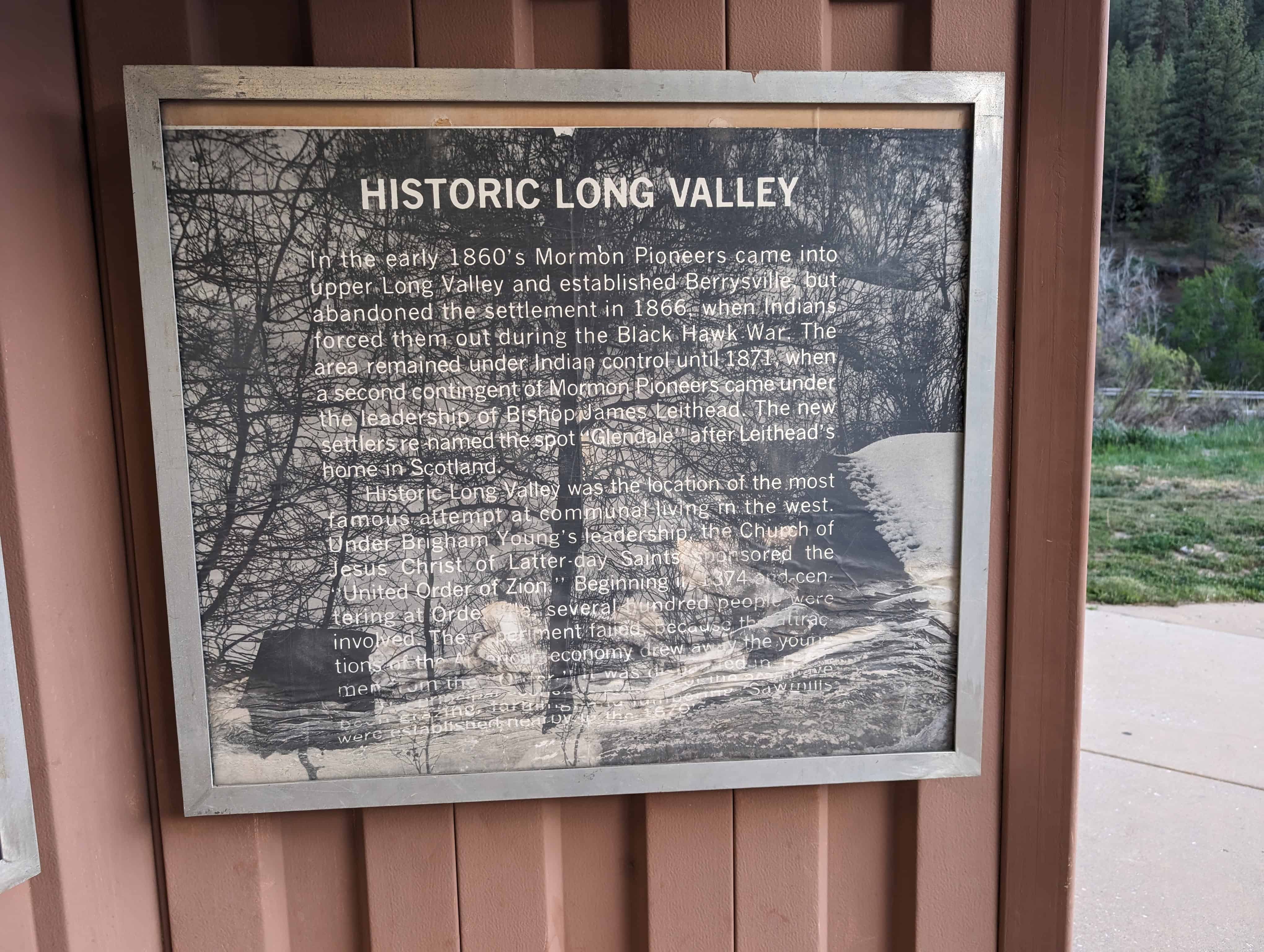 Historic Long Valley was the location of the most famous attempt at communal living in the west. Under Brigham Young’s leadership, the church of Jesus Christ of Latter-day Saints sponsored the “United Order of Zion.” Beginning in 1874 and centering at Orderville, several hundred people were involved.