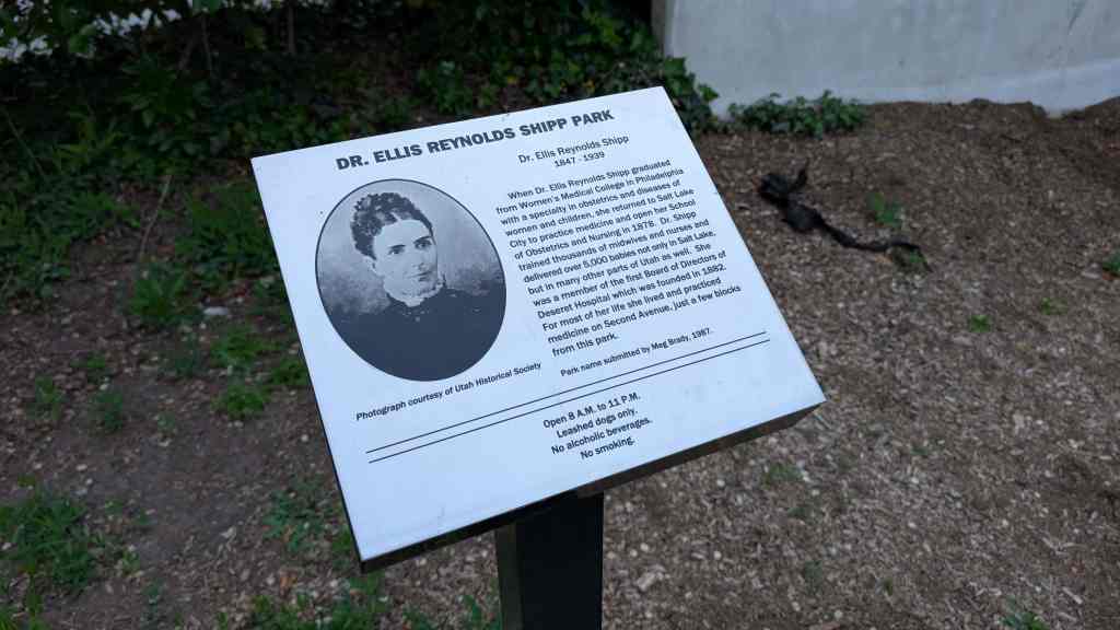 Dr. Ellis Reynolds Shipp 1847-1939 When Dr. Ellis Reynolds Shipp graduated from Women’s Medical College in Philadelphia with a specialty in obstetrics and diseases of women and children, she returned to Salt Lake City to practice medicine and to open her school of Obstetrics and Nursing in 1878. Dr. Shipp trained thousands of midwives and nurses and delivered over 5,000 babies not only in Salt Lake, but in many other parts of Utah as well. She was a member of the first Board of Directors of Deseret Hospital which was founded in 1882. For most of her life she lived and practiced medicine on Second Avenue, just a few blocks from this park.