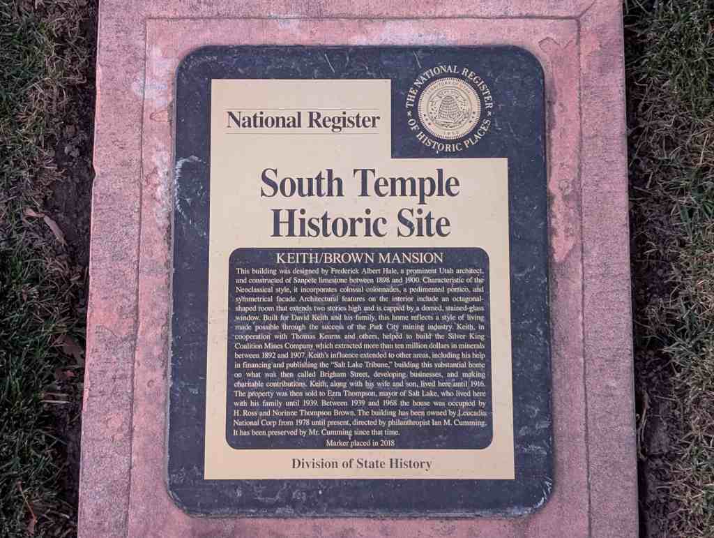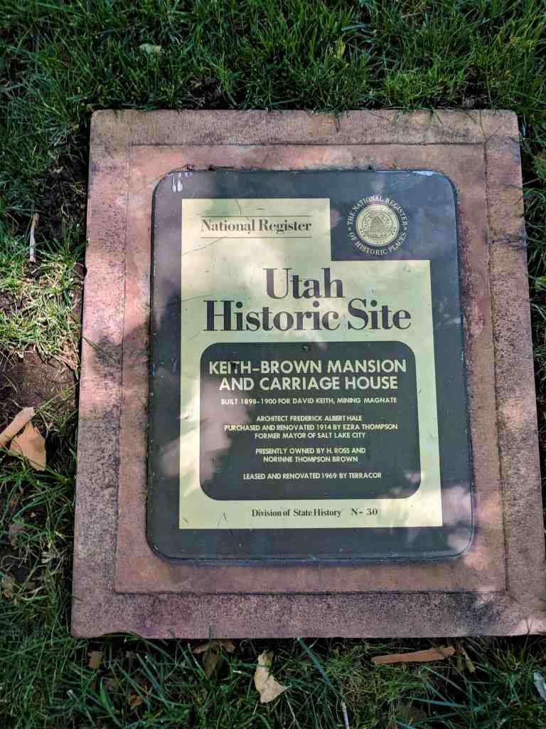 This building was designed by Frederick Albert Hale, a prominent Utah architect, and constructed of Sanpete limestone between 1898 and 1900. Characteristic of the Neoclassical style, it incorporates colossal colonnades, a pedimented portico, and symmetrical façade. Architectural features on the interior include an octagonal-shaped room that extends two stories high and is capped by a domed, stained-glass window. Built for David Keith and his family, this home reflects a style of living made possible through the success of the Park City mining industry. Keith, in cooperation with Thomas Kearns and others, helped to build the Silver King Coalition Mines Company which extracted more than ten million dollars in minerals between 1892 and 1907. Keith’s influence extended to other areas, including his help in financing and publishing the “Salt Lake Tribune”, building this substantial home on what was then called Brigham Street, developing businesses, and making charitable contributions. Keith, along with his wife and son, lived here until 1916. The property was then sold to Ezra Thompson, mayor of Salt Lake, who lived here with his family until 1939. Between 1939 and 1968 the house was occupied by H. Ross and Norinne Thompson Brown.