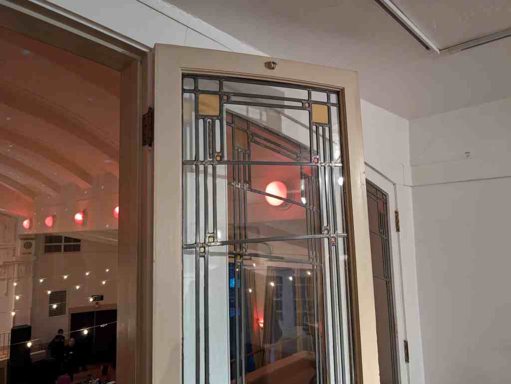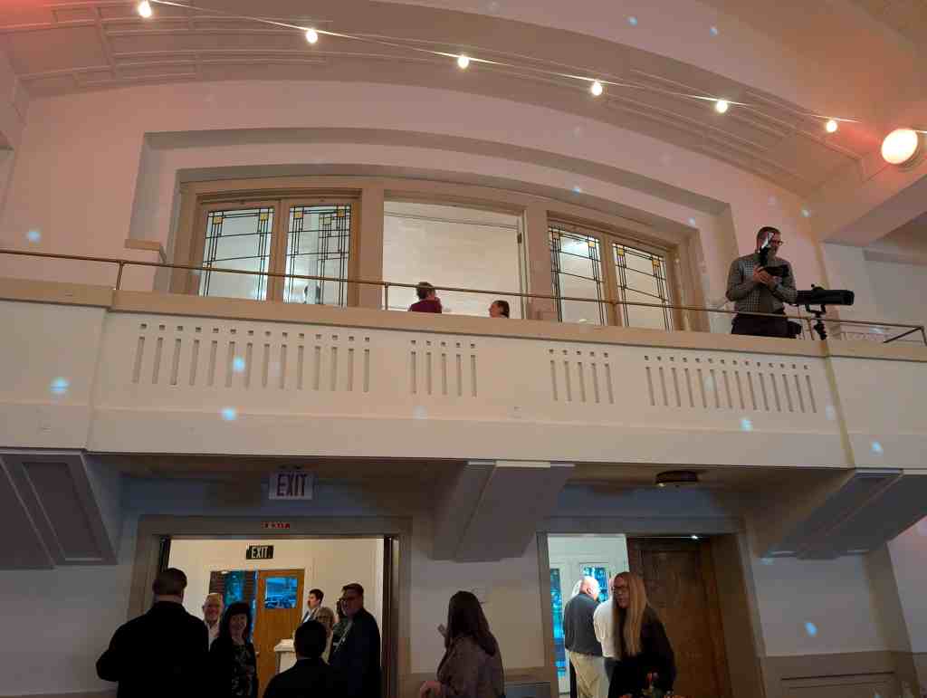Built in 1912, the Ladies Literary Club Building is considered one of Utah’s finest examples of the Prairie style. This style’s horizontal emphasis is reflected in the building’s rows of casement windows, the porch extending across the entire front facade, bands of wood inlay on the second story, and wide eaves. A porch roof supported by brick piers shelters the entryway and extends over the driveway to the west to form a porte-cochere. Restrained ornamentation, like the wood inlay on the porch ceiling and the exquisite leaded glass, are also in keeping with the spare feeling of the Prairie style.