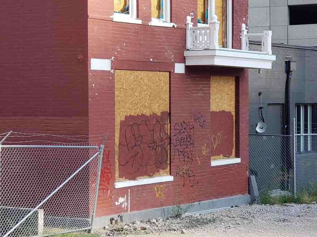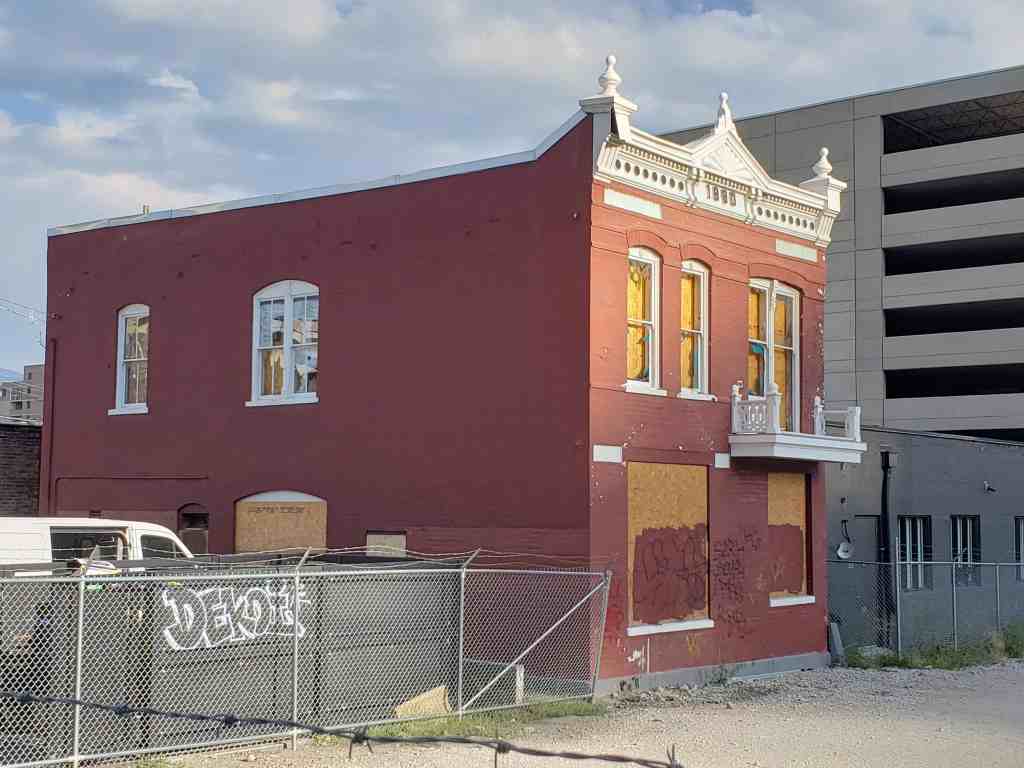 This two story brick structure functioned as a home and business from its building in 1890. It exhibits characteristics of late nineteenth century Western commercial architecture in its use of materials, plan and construction, and decorative elements. The main facade piercing is asymmetrical below a highly decorative metal cornice arrangement. Segmentally arched openings are located at the second story level, where a double unit arrangement opens onto a small balcony. Flat arched windows with stone lintels mark the first floor level of the main facade. Stained glass panels are incorporated into these windows. Entrances and secondary window configurations are located on side elevation.