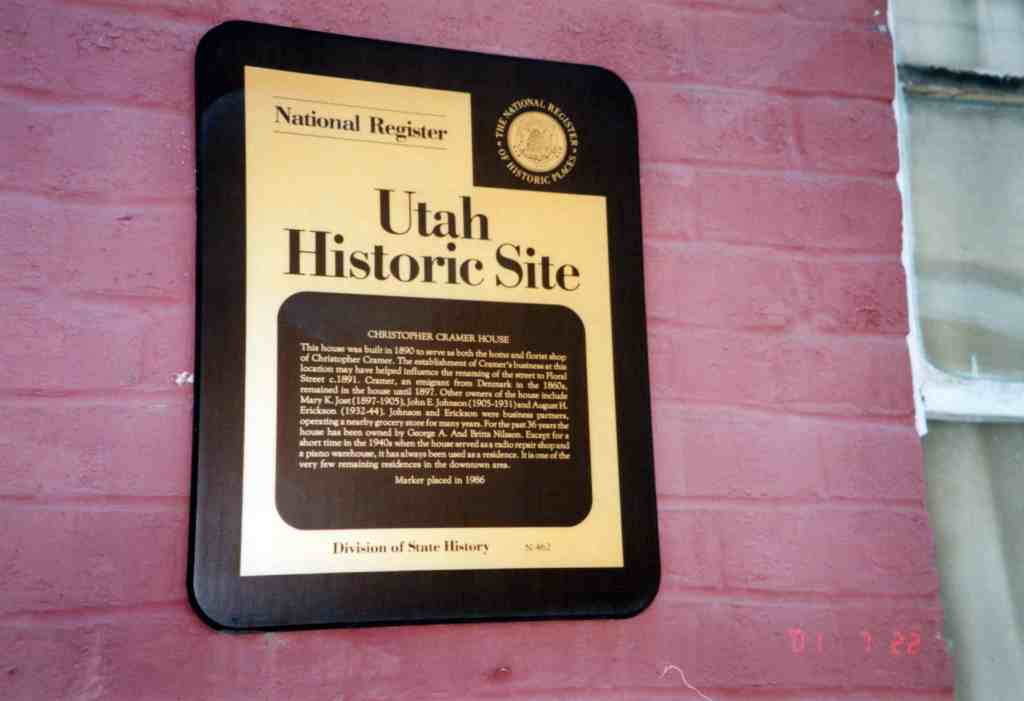 Christopher Cramer built the home in 1890. It served as not only his residence, but also housed his floral shop. Cramer was born in Denmark, December 1, 1851. He came to Salt Lake in the 1860’s and became a florist. In 1897 Cramer sold the house to ?? Crandal and moved his business to another location in the city, the corner of 15 South and 3rd East. Crandal sold to Mary K. Jost that same year. In 1905, Jost sold to John E. Johnson. Johnson operated Scandra Grocery Store near by at 156 E. ? South. Johnson was a partner of August H. and Alma Erickson.