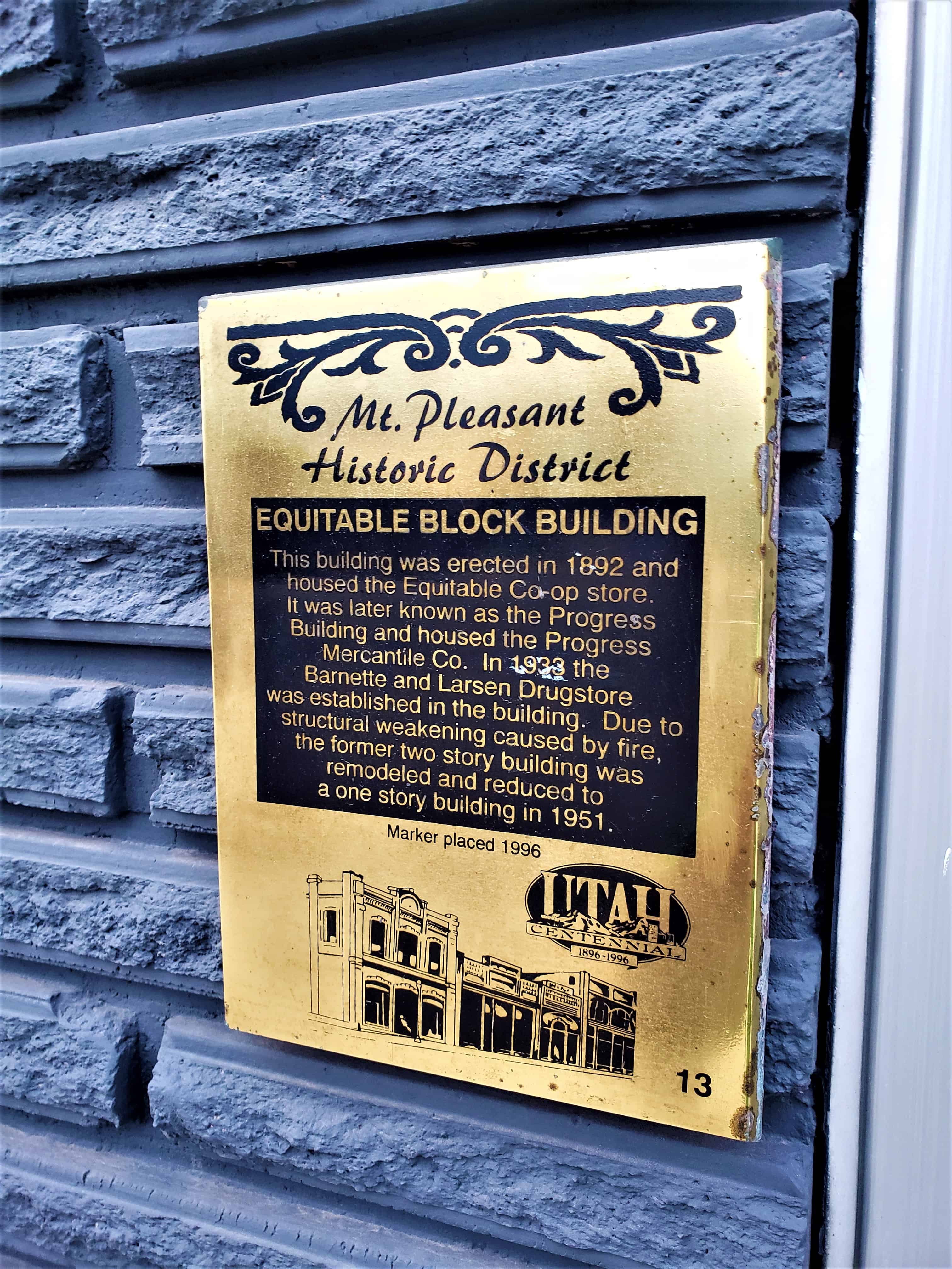 This building was erected in 1892 and housed the Equitable Co-op store. It was later known as the Progress Building and housed the Progress Mercantile Co. In 1933 the Barnette and Larsen Drugstore was established in the building. Due to structural weakening caused by fire, the former two story building was remodeled and reduced to a one story building in 1951.