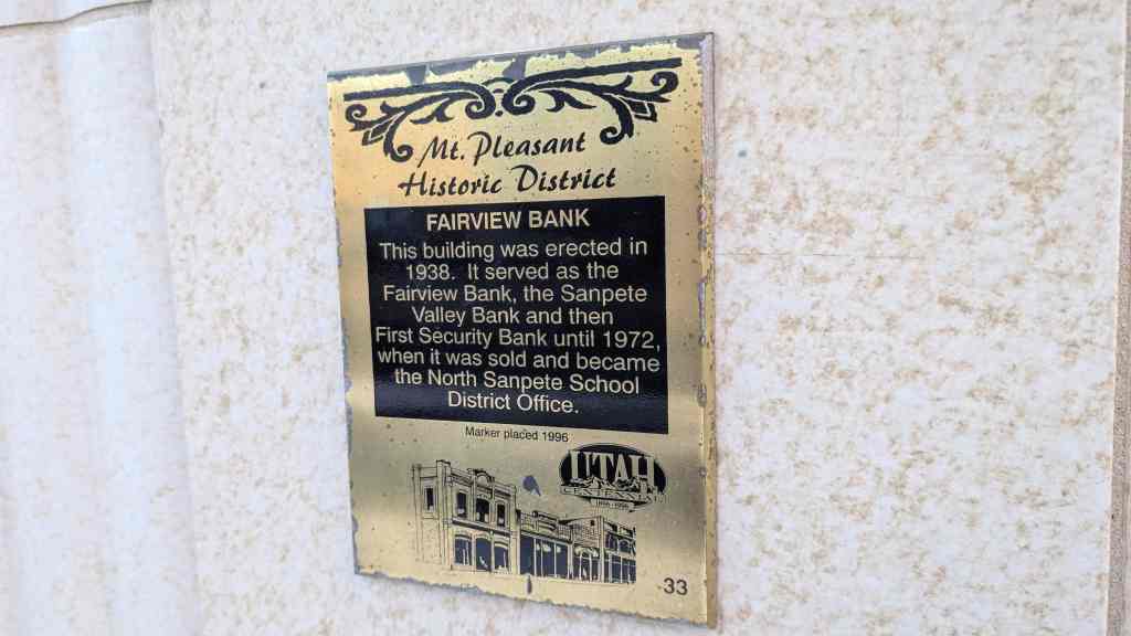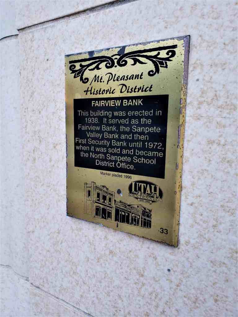 This building was erected in 1938. It served as the Fairview Bank, the Sanpete Valley Bank and then First Security Bank until 1972, when it became the North Sanpete School District Office.