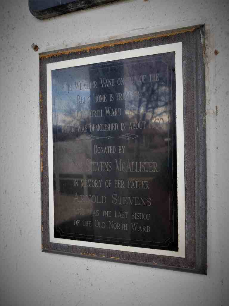 The weather vane on top of the Relic Home is from the Old North Ward Church which was demolished in about 1950, donated by Joan Stevens McAllister in memory of her father, Arnold Stevens.
