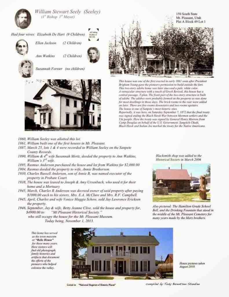 Built c. 1861, this house is significant as the reported site of the signing, in September 1872, of the final peace treaty that ended the Black Hawk War between Mormon settlers and Indians in the area. William S. Seeley was prominent in the establishment and subsequent growth of the City of Mt. Pleasant, serving for nearly thirty years as the LDS Bishop in the community and concurrently as mayor for a total of seven years. Seeley lived in this house, reportedly the first built outside the walls of the pioneer fort, until his death in 1895.