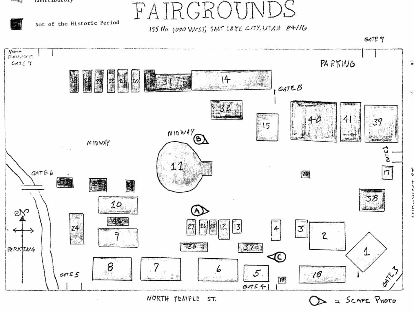 The Utah State Fairgounds is a seventy acre area on Salt Lake City’s west side that has been the site of the annual Utah State Fair since 1902. There are forty two permanent structures on the grounds, dating from 1902 to the mid-1970s. Twenty seven of the forty two buildings are contributory, while fifteen fall out of the historic period and/or are not considered to have architectural or historic significance. Most of the buildings are for exhibition purposes. A few of them were built for other purposes, serving as cafes, restrooms, and offices. The grounds reflect several phases of building activity. In the early years, the substantial structures were built: the Horticulture Building (1902), the Exhibition Hall (1905), and the Coliseum (1913). The architects of the first two buildings were Walter E. Ware and Alberto 0. Treganza, prominent Utah architects. Among the buildings they designed were Salt Lake City’s First Presbyterian Church, University Club Building, Aviation Club Building, F.W. Woolworth Store, Westminster College Gymnasium, the Mt. Pleasant Presbyterian Church, and Logan’s St. Anthony Catholic Church. The architects of the Coliseum were Joseph Carlos Young and his son Don Carlos Young. A son of Brigham Young, Joseph Don Carlos Young was architect of the Mormon Church for fifty years. Among his works was the LDS Church Office Building at 47 East South Temple Street. His son, Don Carlos Young, worked with his father for many years. Among the buildings he helped design were the Federal Reserve Bank Building in Salt Lake City, and the Arizona LDS Temple at Mesa. The second building phase on the Fairgrounds occurred in the 1920s when the present Grandstand and nearly a dozen other buildings were completed. In the last decade, several permanent structures have been added, some of them reflecting a movement away from the site’s exclusive, use as a fairground.