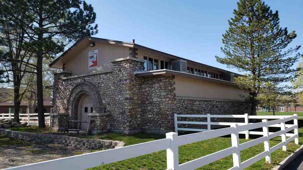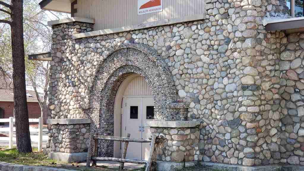 - (4) Fish and Game Building: 1921, one story, gable roofed exhibition hall of cobblestone and frame. Side wings have flat roofs and entrances have rounded arched openings.