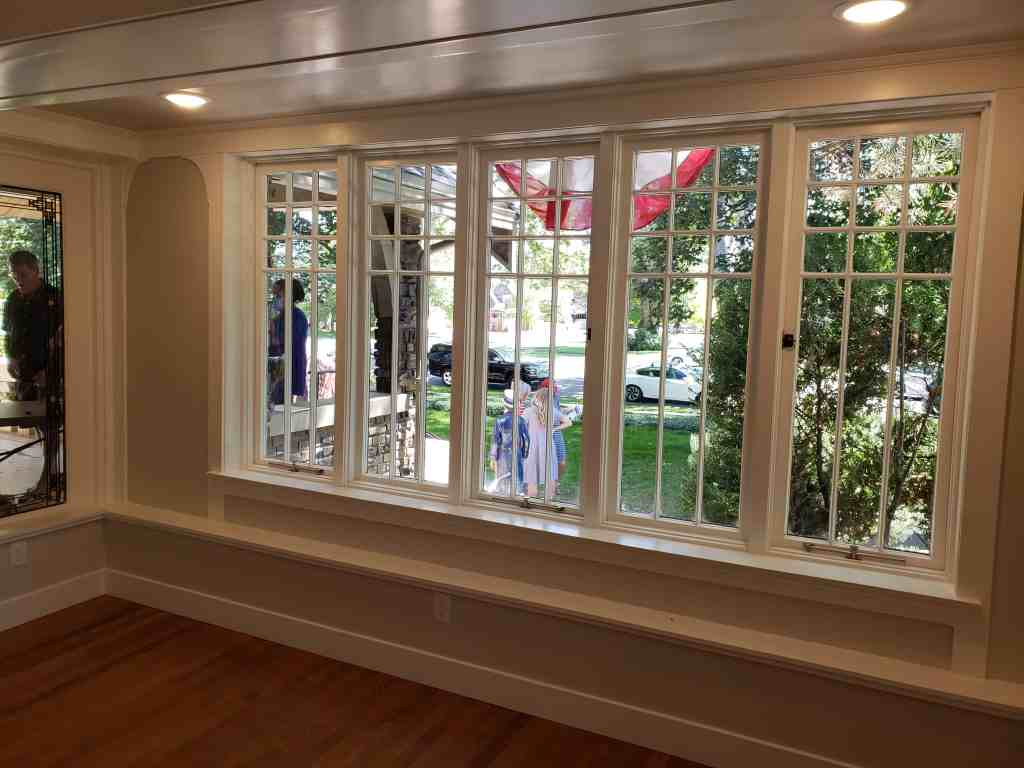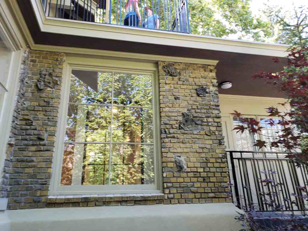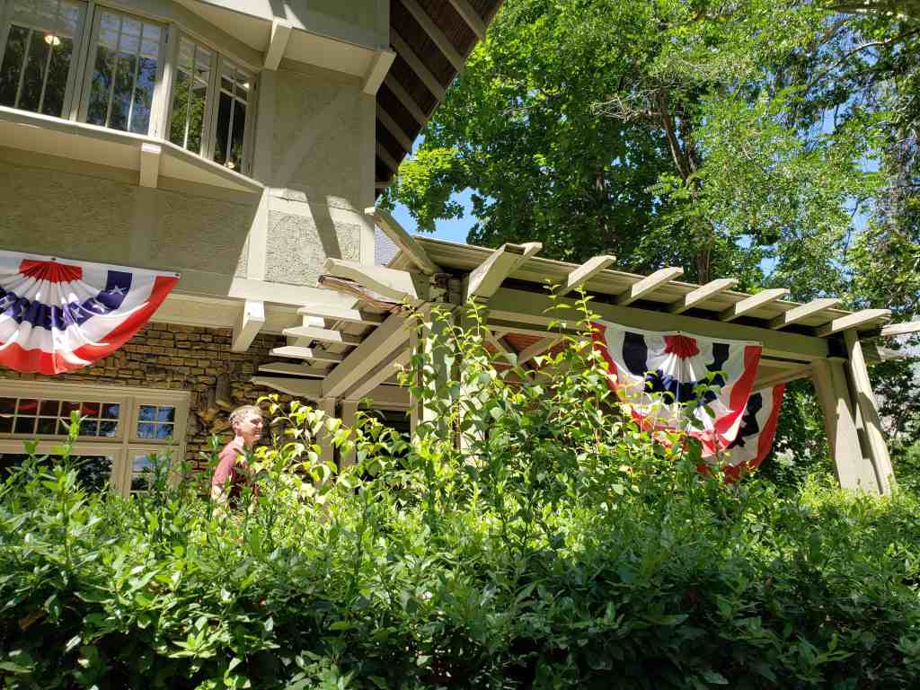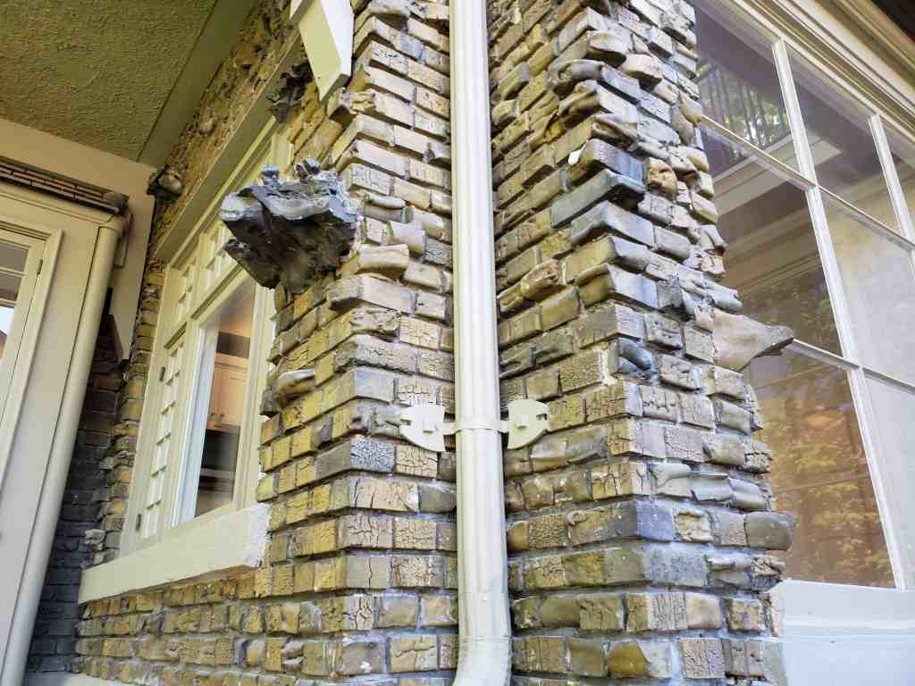 Clinker brick has been used for the first story, for the posts of the porch, for the chimneys, and for the wall that surrounds the house. The upper stories are wood frame and stucco with stick work. The windows are grouped in various arrangements, including a three part bay window on the second story gable end of the façade, and are casements with decorative wood stripping.