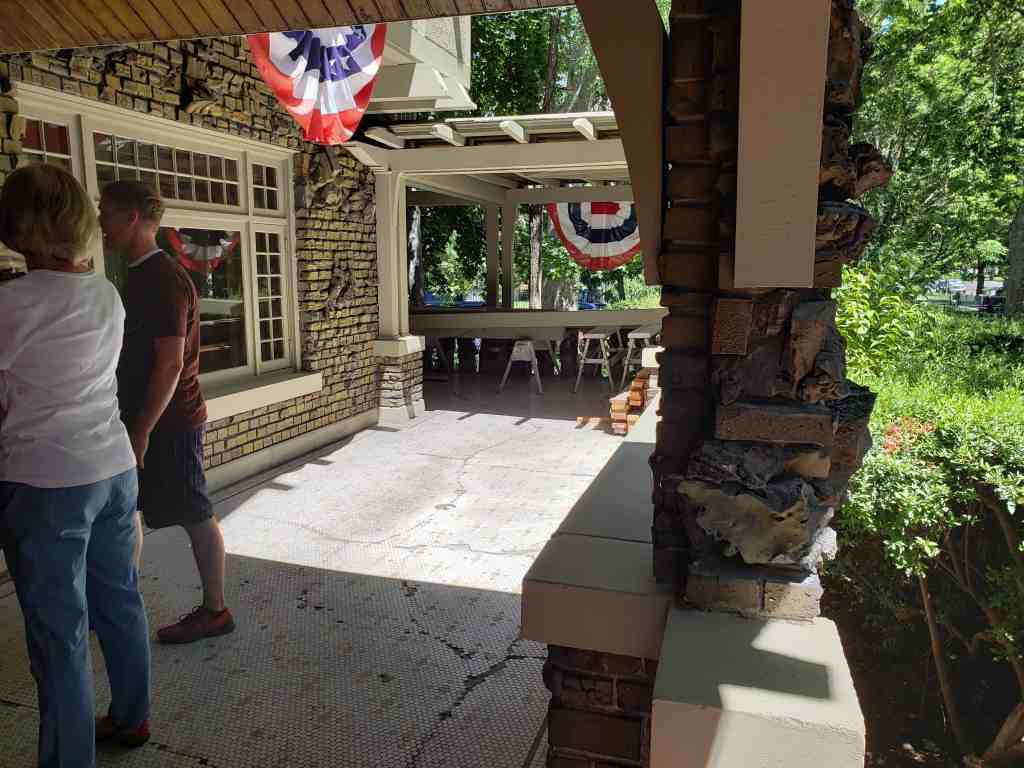 The main entrance is set under an open porch whose gable roof repeats the lines of the cross gable and the dormer. It is supported by clinker brick piers. An all glass door is flanked by side lights which have stained glass stripping around their edges. The craftsman elements which tie the building together include: the variety of materials; the use of natural materials and structural elements for ornamentation; the bands of windows accented by stickwork; the stickwork of the upper stories, exposed rafters, purlins, and brackets; and the irregular massing coupled with an organic balance.