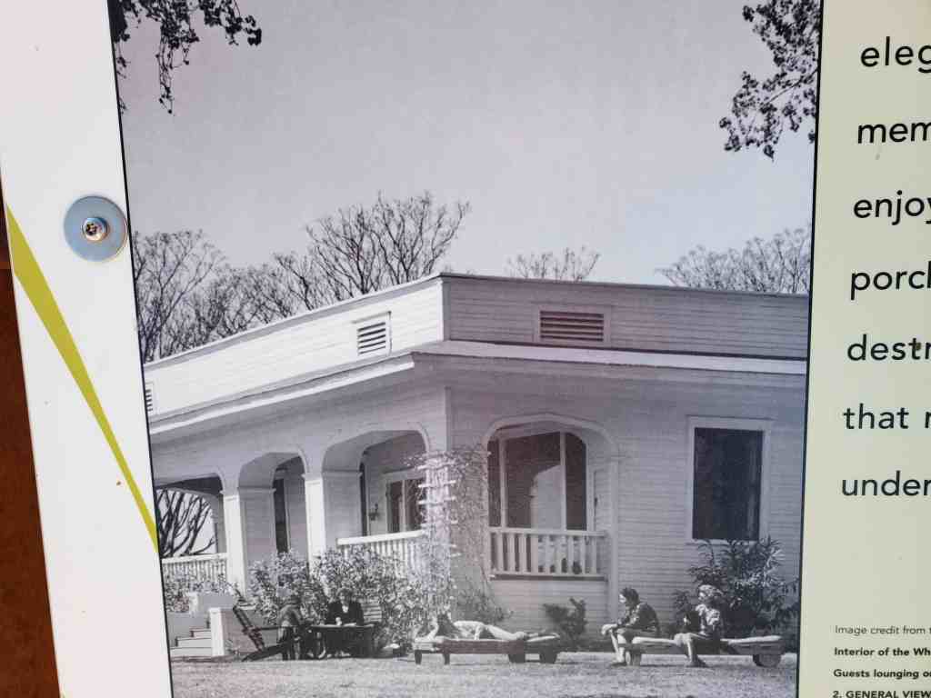 6. Cement Brick House-Another duplex built in 1939 by Edwin Losee. It is similar in outline to the Blue House, but features a full porch across the front as part of the concrete slab under the structure. The styling is Western Ranch. A simple rectangle with a low pitch roof featuring a massive cement lock chimney serving both sides. Window frames and mullens are metal hinged to open from the sides. The structure is in poor condition and will be torn down as it does not have historical or architectural merit.