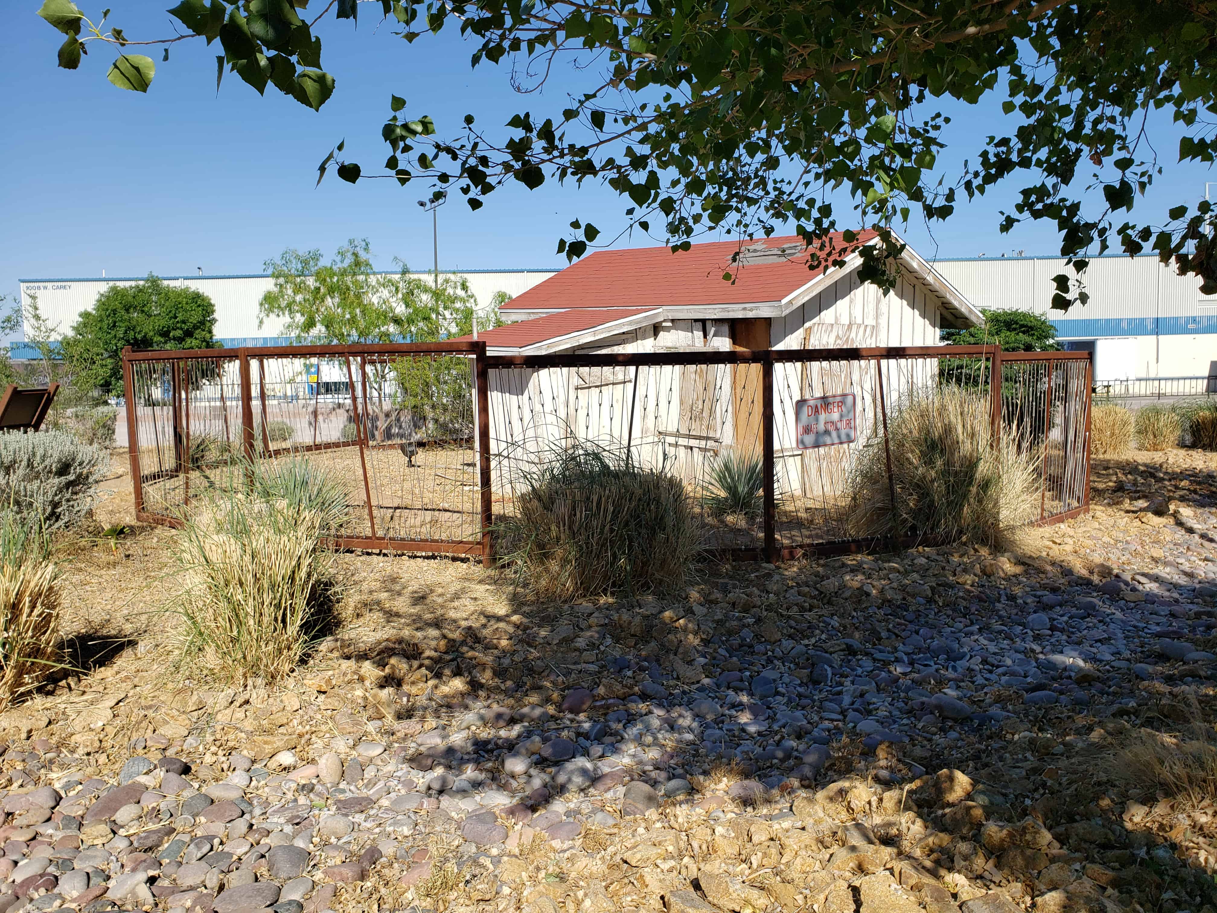 2. White House-built by John S. Park, Manager of the Las Vegas Land and Water Company. The company was formed by Senator William Clark to acquire land and water sources for his San Pedro, Los Angeles and Salt Lake Railroad. He acquired the ranch from the Kiel estate in 1903 and Park began construction of a large, single story, frame house with clapboard siding in 19/07. The style is unique, with a deep porch under a common roof across the front. The structure features a high, semiopen cellar underneath and a double roof separated by a crawl (vent) space. The lower roof is of hip-frame construction and the upper structure is a flat built-up roof. The house is in poor condition, appearance wise, but it is structurally sound. It will be rehabilitated and utilized by the city of North Las Vegas, Department of Parks and Recreation as a museum of local history.
