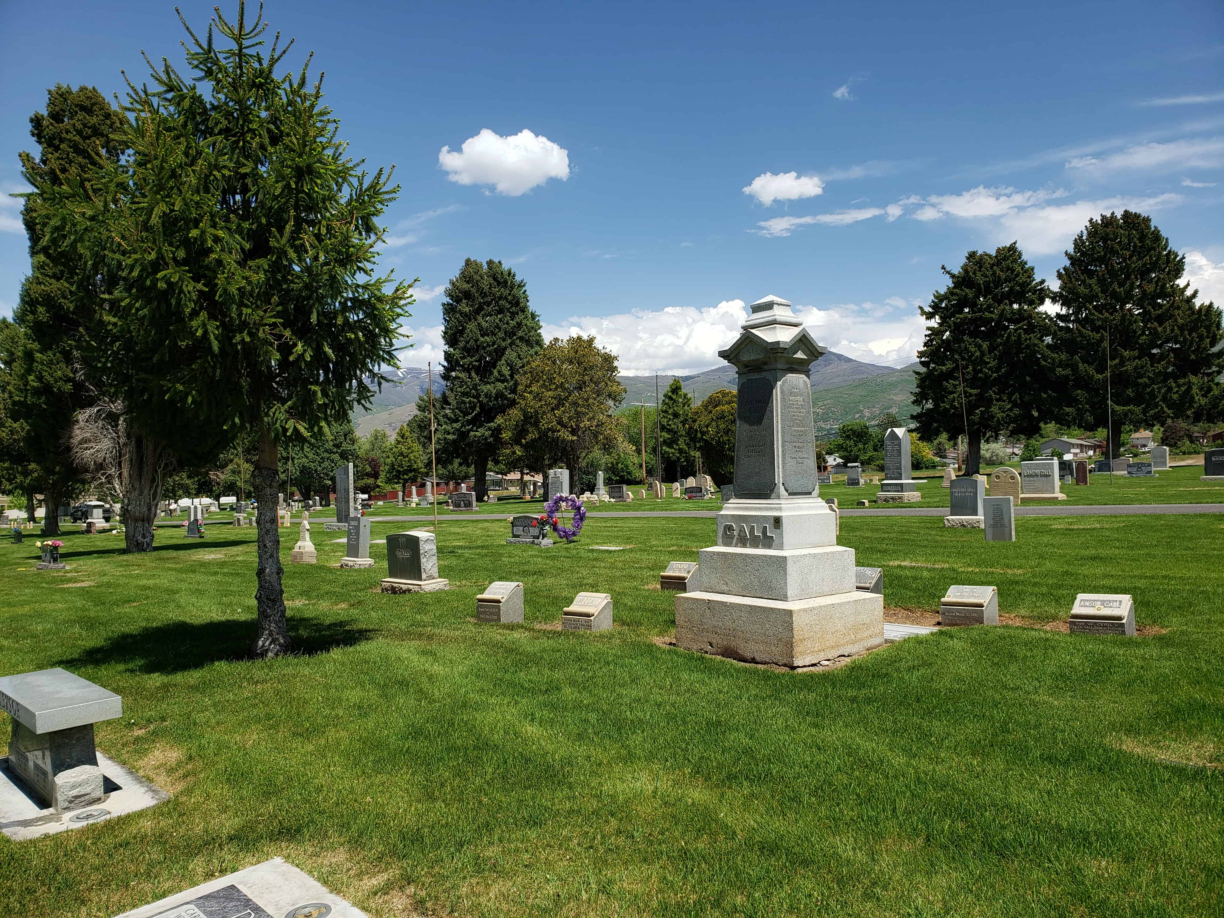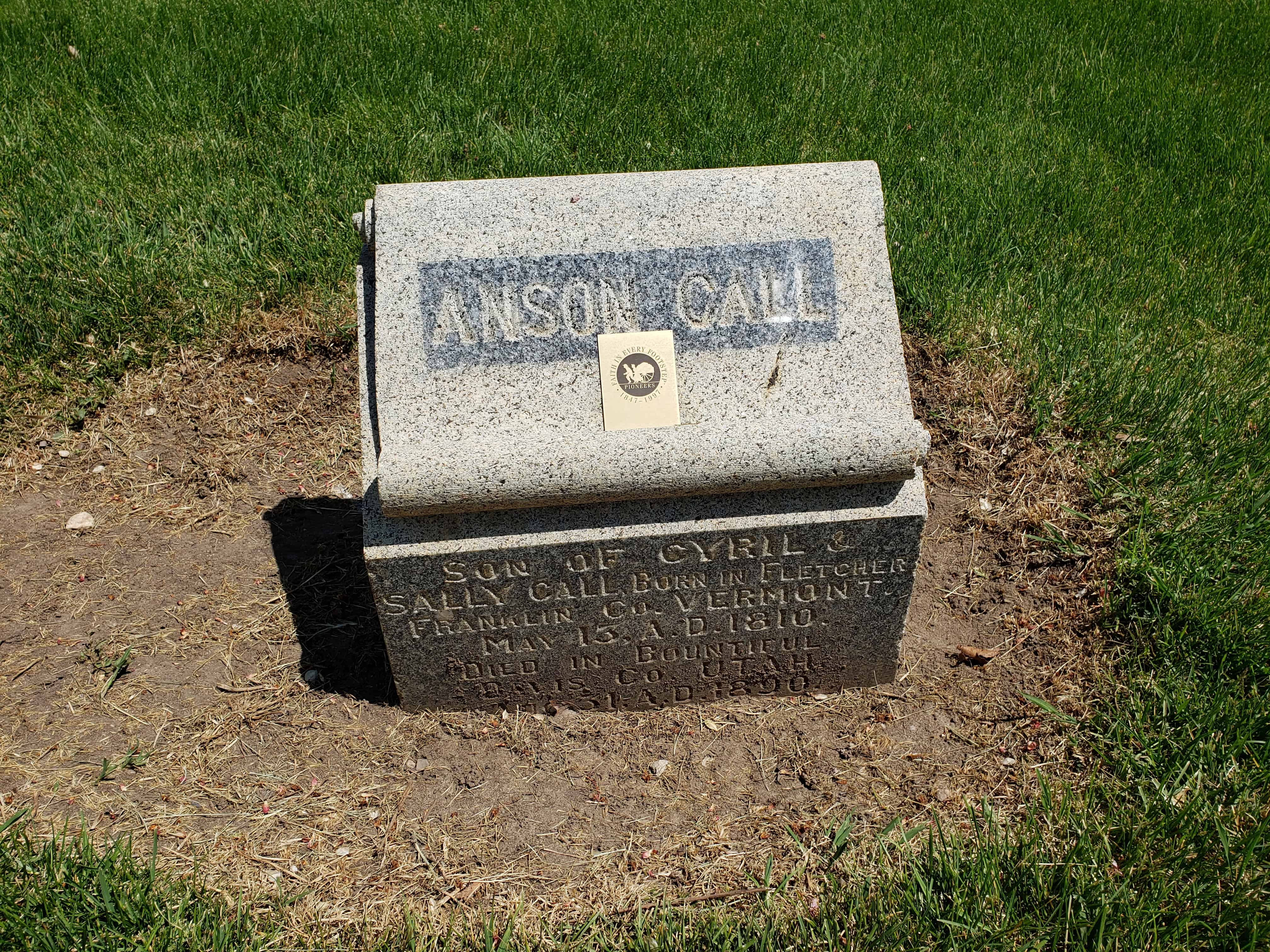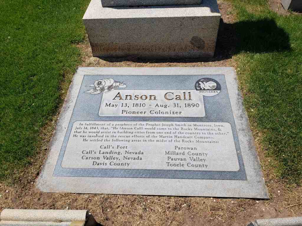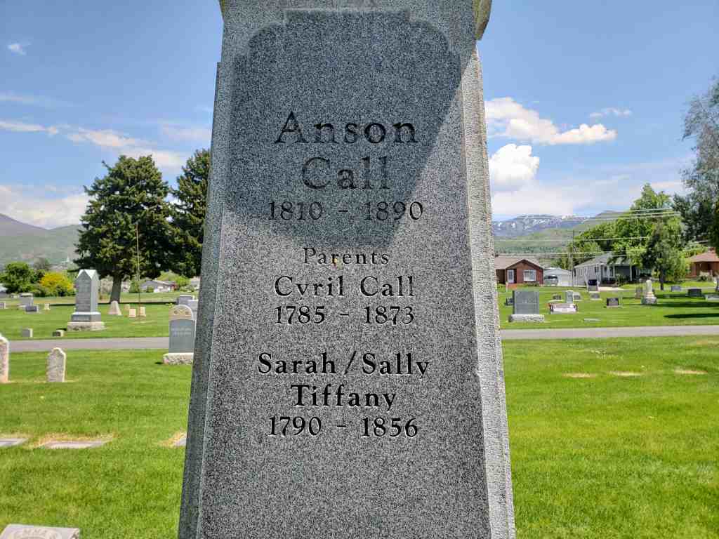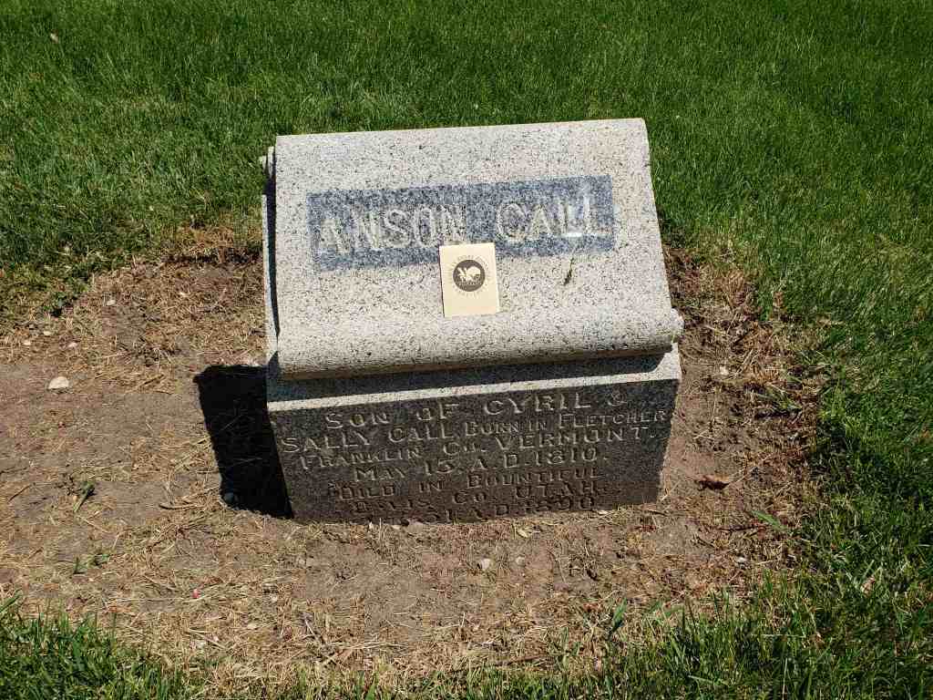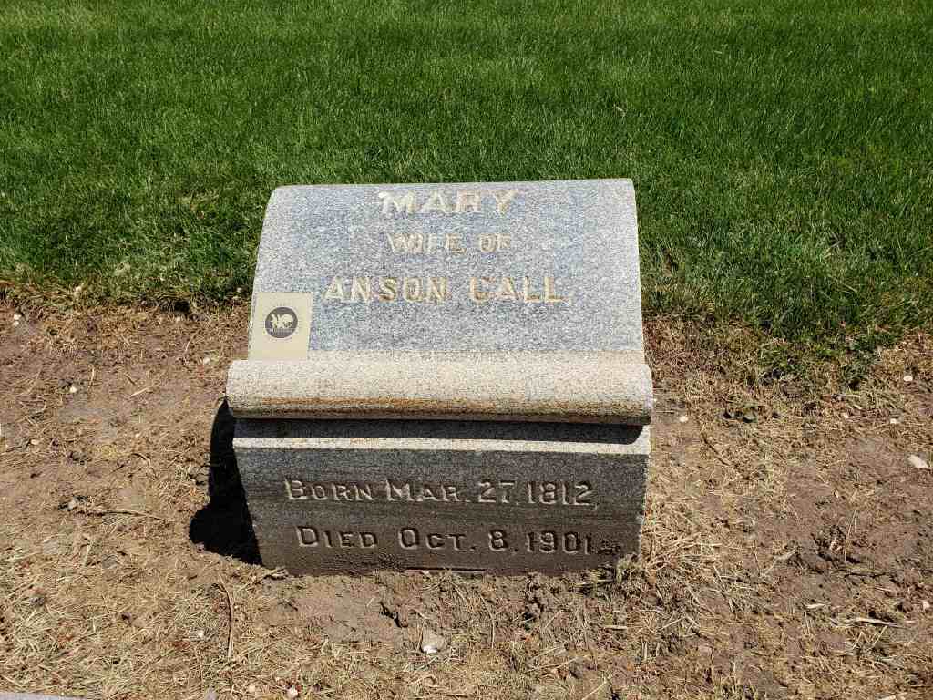 Son of Cyril and Sally or Sarah Tiffany Call married Mary Flint and later joined the Mormon Church. “He was closely associated with the Prophet Joseph [Smith, 1805-1844], and with the saints was driven from his home. He had a great love for the Prophet and did all he could to protect him from the mobs.” Smith once said of Call: “There is Anson. He shall go [to the West] and shall assist in building cities from one end of the country to the other.” Call started West in a company led by Brigham Young, the second president of the LDS Church. Call came to Salt Lake City, Utah, in 1848. He helped settle Bountiful, the Little Salt Lake Valley, “Pauvant Valley” (Fillmore), Box Elder and Davis Counties, all in Utah, and Carson Valley, Nevada.