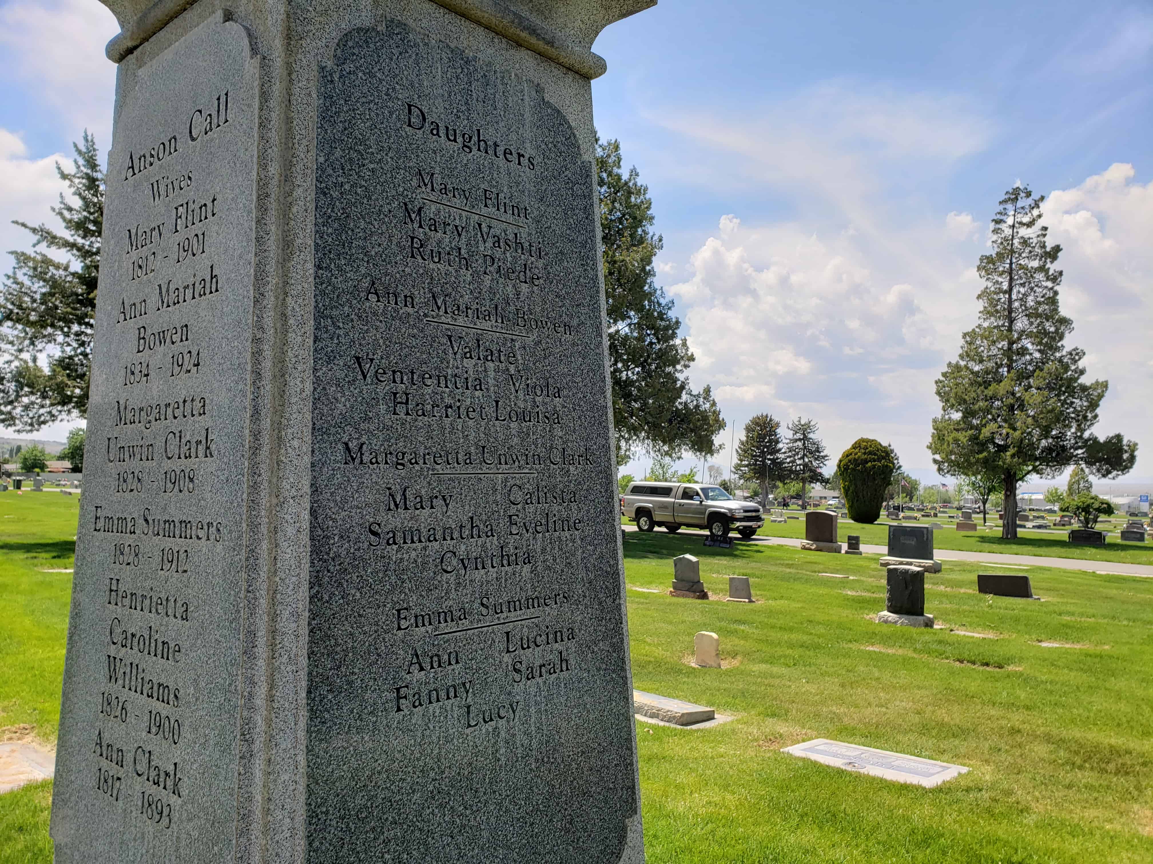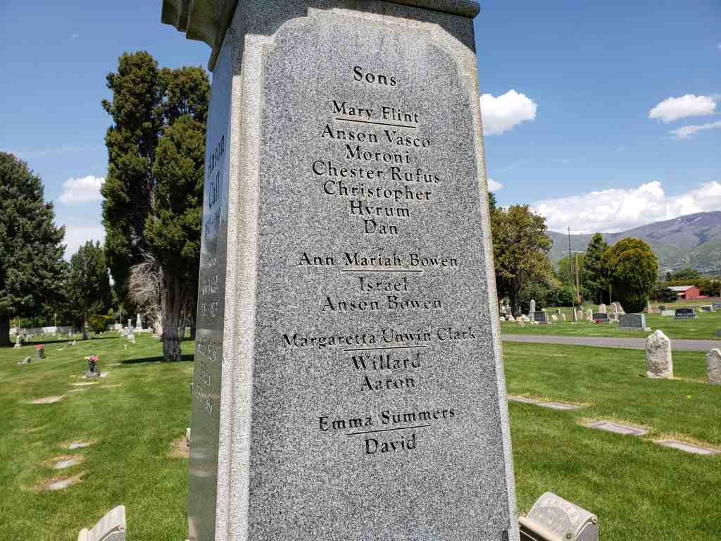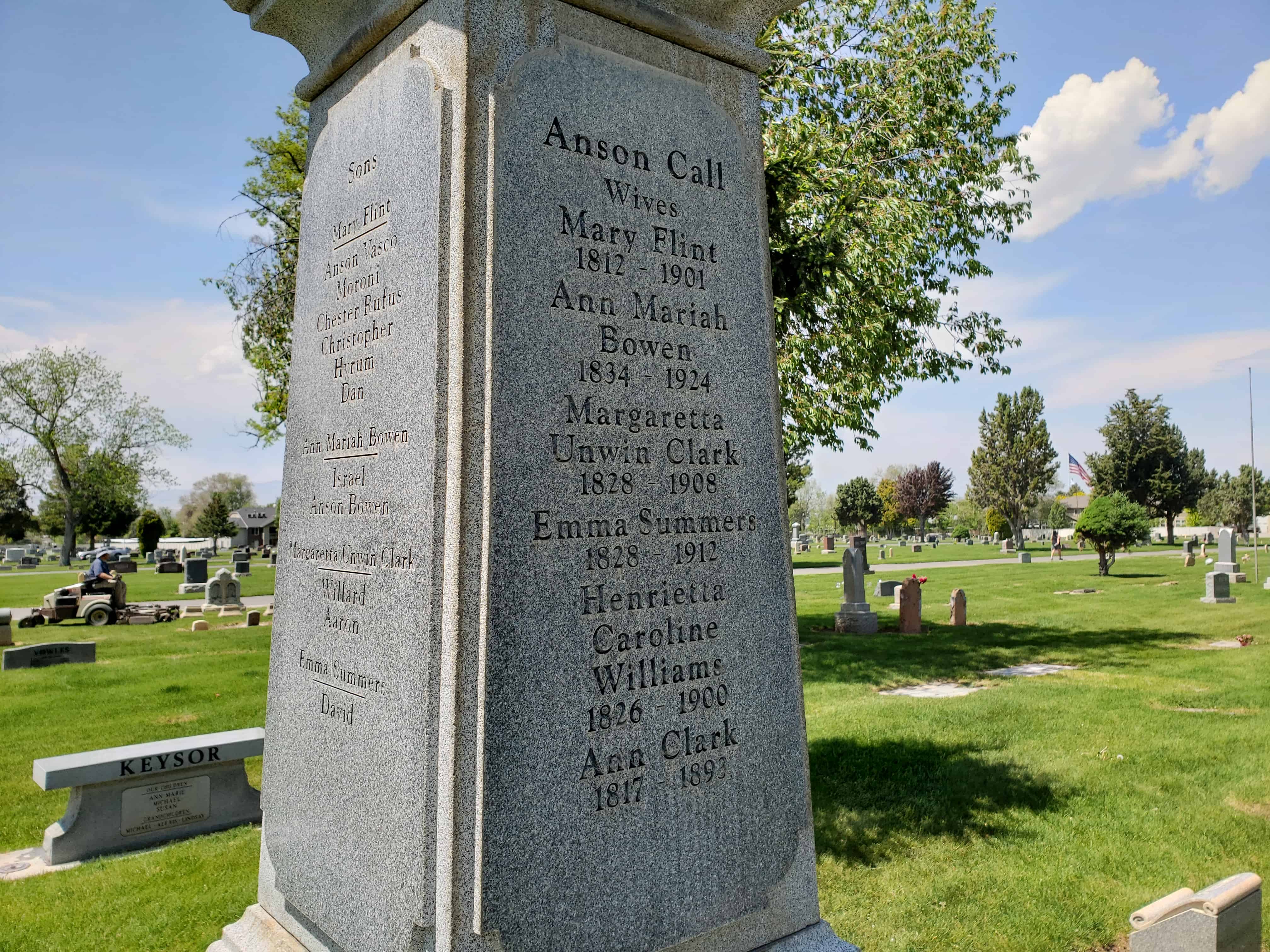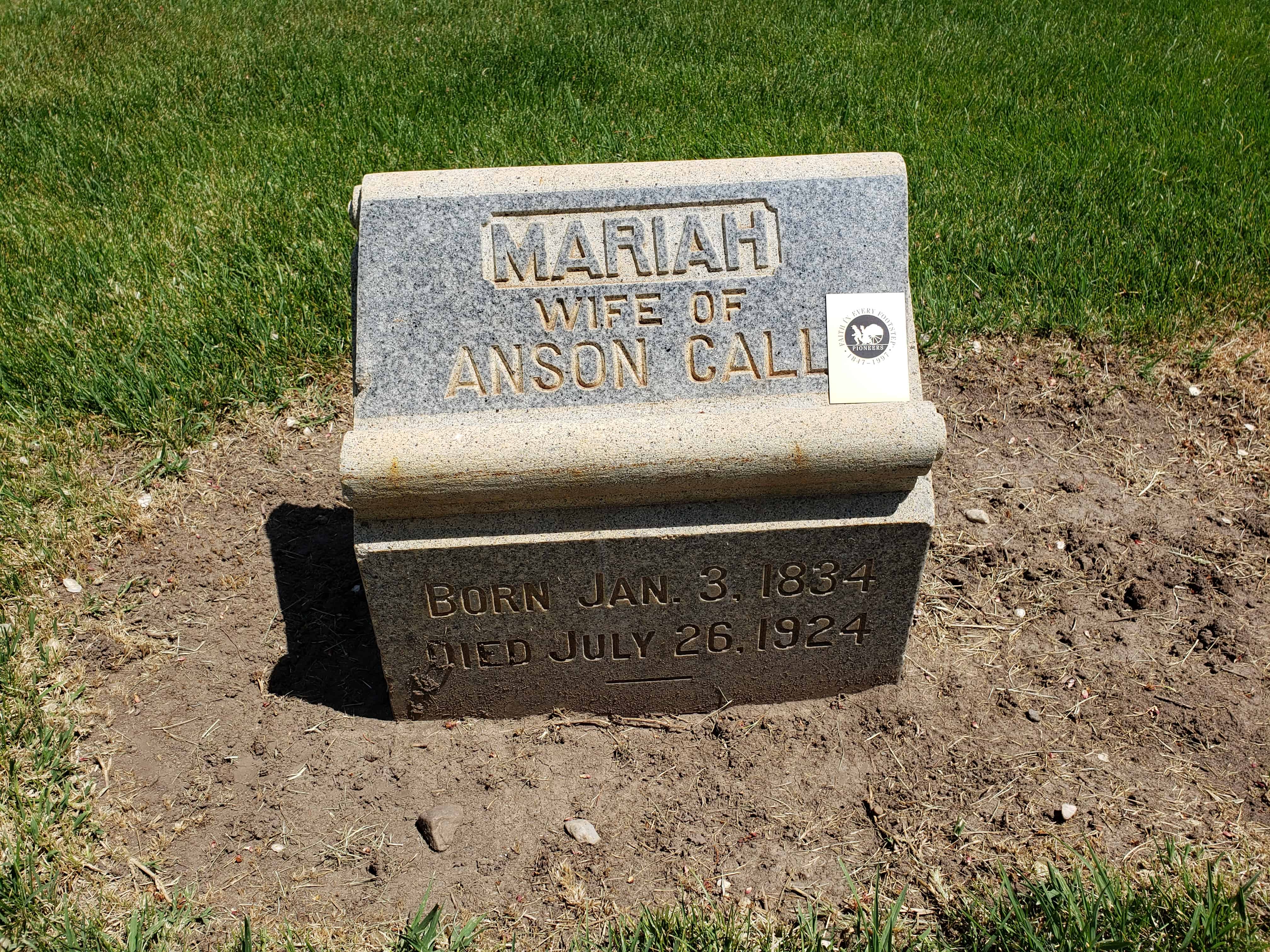 Son of Cyril and Sally or Sarah Tiffany Call married Mary Flint and later joined the Mormon Church. “He was closely associated with the Prophet Joseph [Smith, 1805-1844], and with the saints was driven from his home. He had a great love for the Prophet and did all he could to protect him from the mobs.” Smith once said of Call: “There is Anson. He shall go [to the West] and shall assist in building cities from one end of the country to the other.” Call started West in a company led by Brigham Young, the second president of the LDS Church. Call came to Salt Lake City, Utah, in 1848. He helped settle Bountiful, the Little Salt Lake Valley, “Pauvant Valley” (Fillmore), Box Elder and Davis Counties, all in Utah, and Carson Valley, Nevada.
