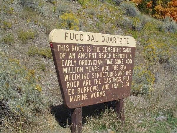 This rock is the cemented sand of an ancient beach deposit in early Ordovician time some 400 million years ago. The seaweed-like structures and the rock are the castings, filled burrows, and trails of marine worms.