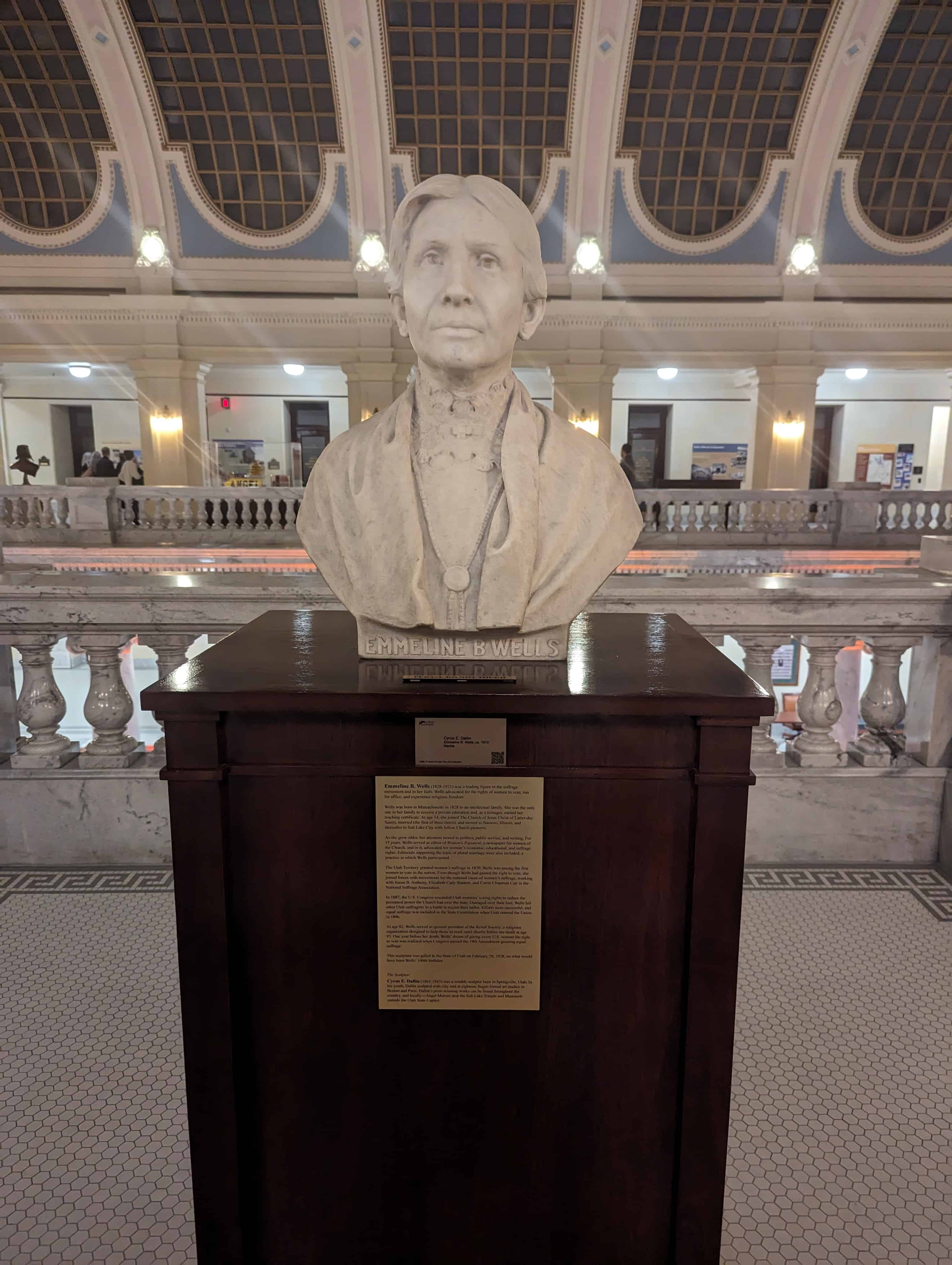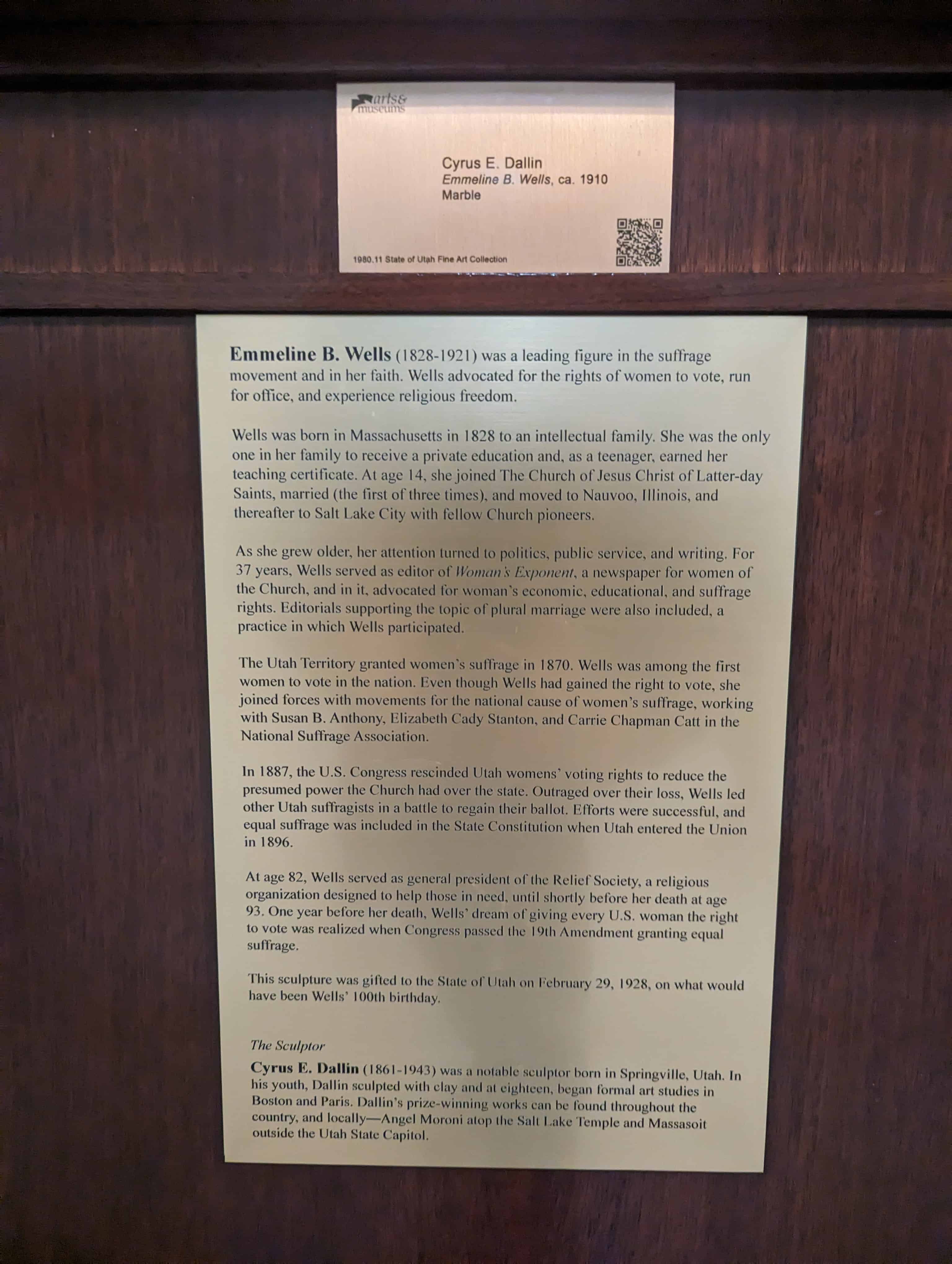 This sculpture was gifted to the State of Utah on February 29, 1928, on what would have been Wells’ 100th birthday.