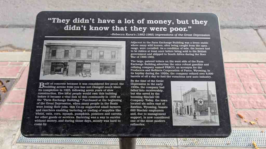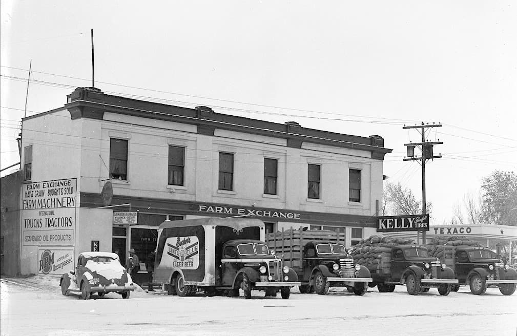 Built of concrete because it was considered fire proof, the building across from you has not changed much since its completion in 1925, following seven years of slow construction. Five local people would own this building before it became a vital link to this community in 1930 as the “Farm Exchange Building.” Purchased at the beginning of the Great Depression, when many people in the Basin were losing their jobs, this Co-op supported small farmers and ranchers enabling bartering or trading of supplies like wheat, oats, corn, squash, pumpkins, potatoes and carrots, for other goods or services. Bartering was a way to survive without money, and during those days, money was hard to come by.