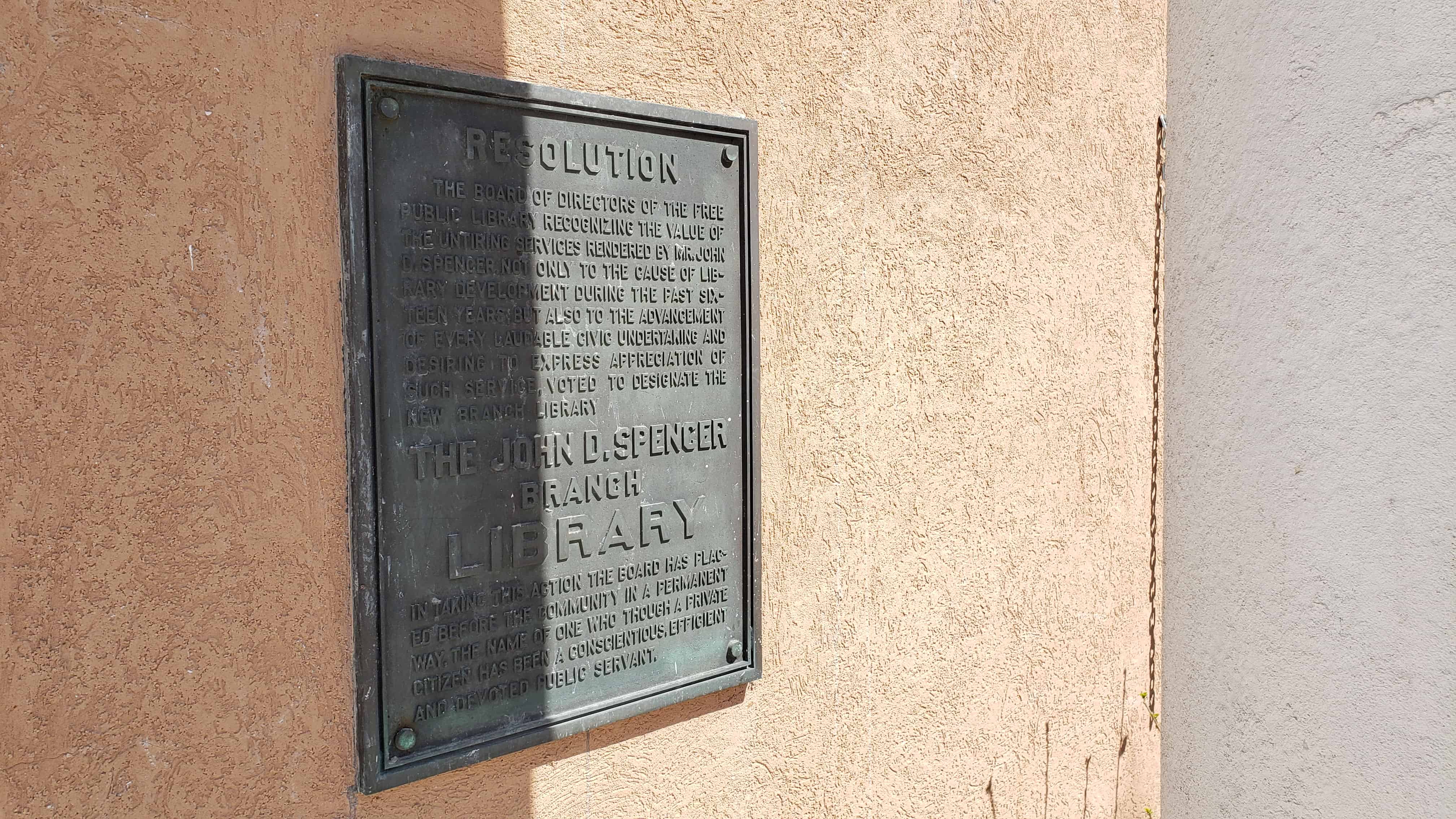 The board of directors of the free public library recognizing the value of the untiring services rendered by Mr. John D. Spencer, not only to the cause of library development during the past sixteen years, but also to the advancement of every laudable civic undertaking and desiring to express appreciation of such service, voted to designate the new branch library.