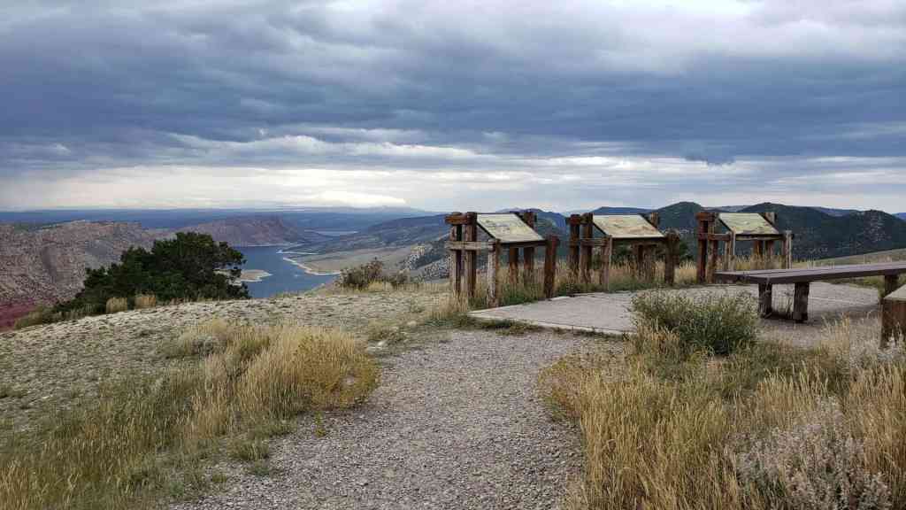 One of the highway pullout areas with information plaques near Flaming Gorge Reservoir.