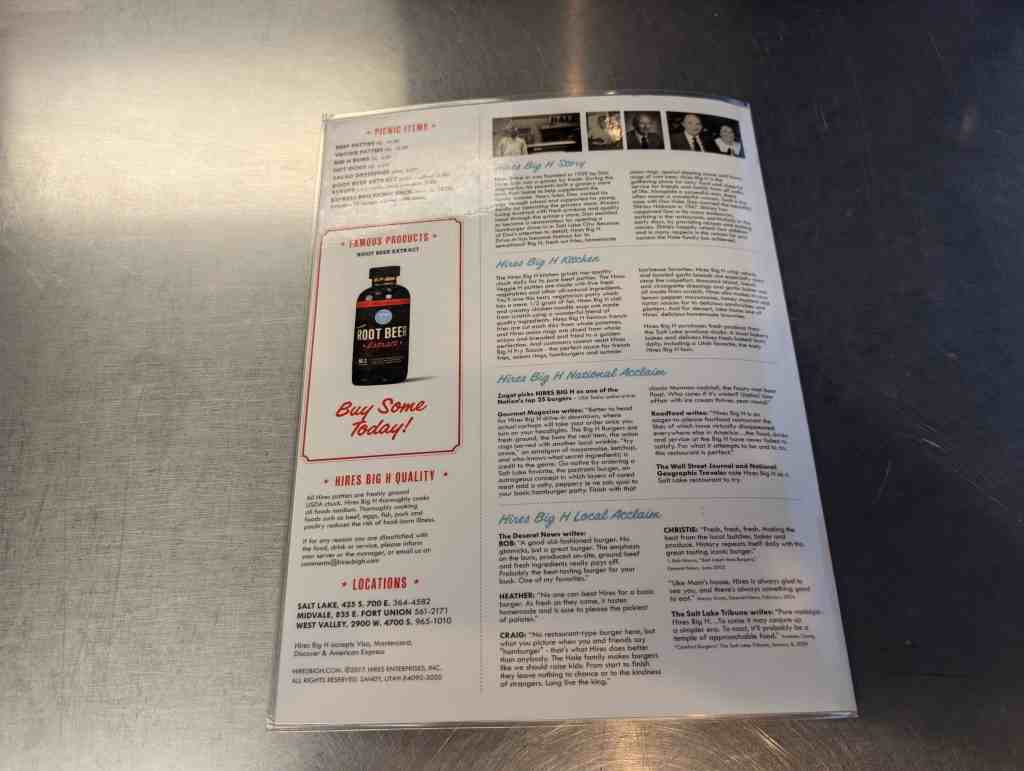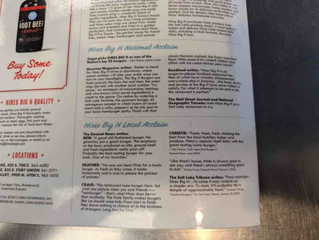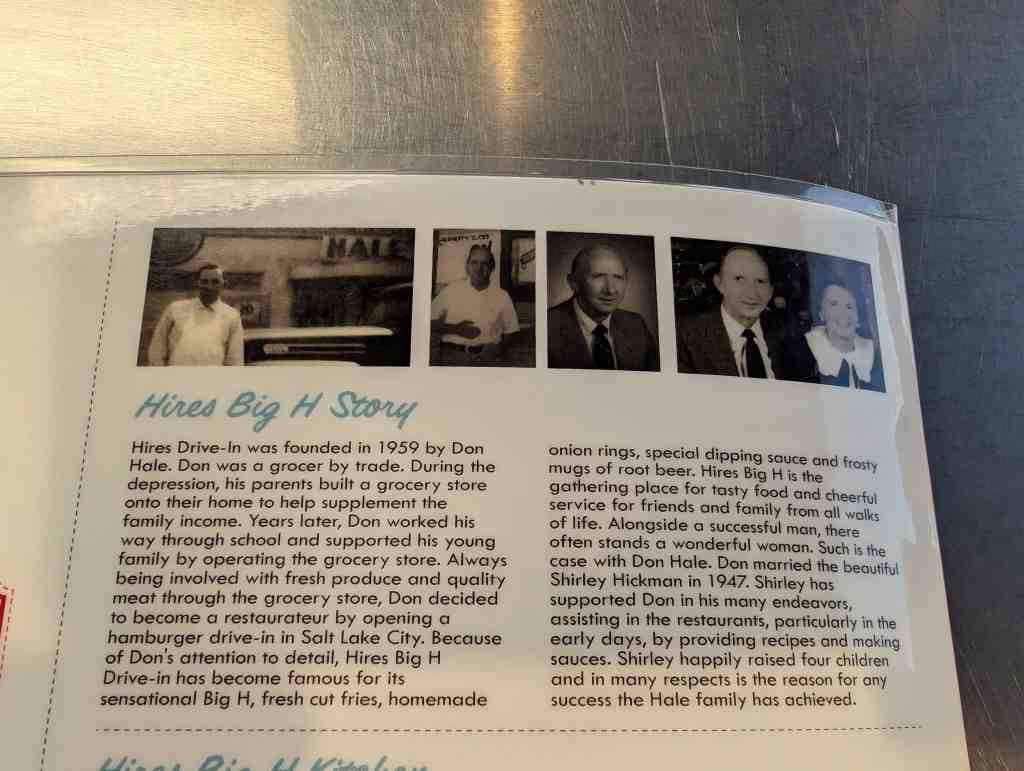 Hires Drive-In, founded in 1959 by Don Hale, is a Salt Lake staple located just a few blocks west of the University of Utah. Hale, who had worked in his family’s grocery store growing up, was no stranger to the food industry and began building a cinder-block building that still stands today at 425 South 700 East. Next door to the restaurant is another of Hale’s business ventures – Litza’s Pizza. The restaurant’s signature burger, The Big H, is known for its distinct pink sauce, a Hale family recipe that is available on many of their menu items and even sold at retail in some stores. – Preservation Utah
