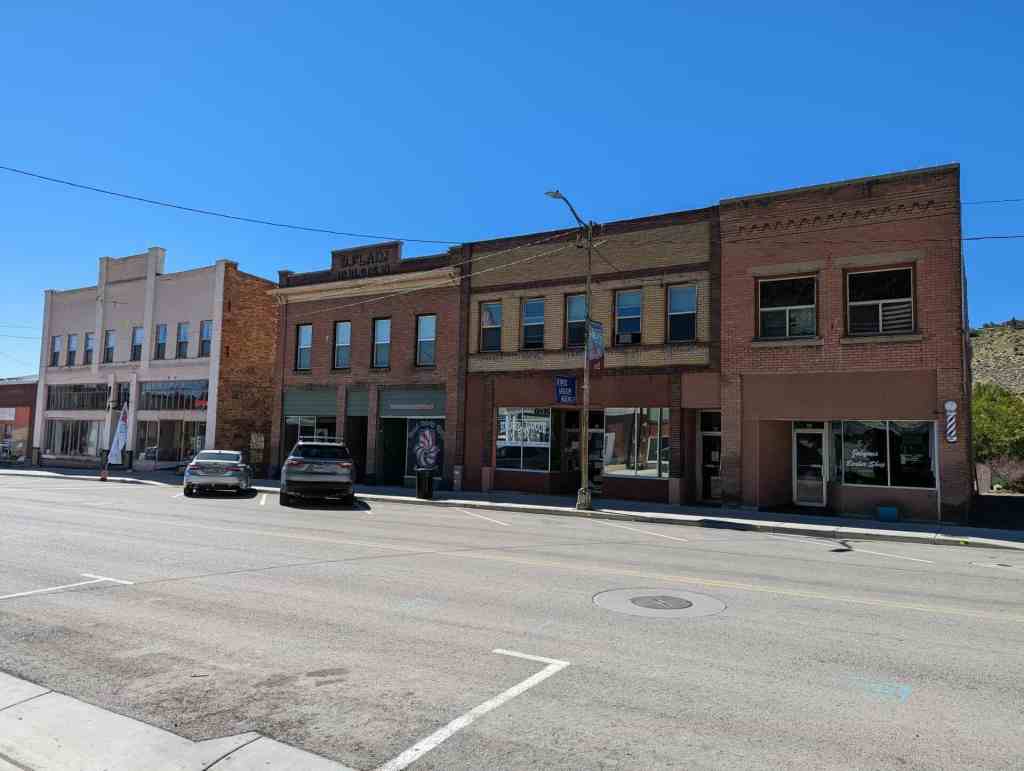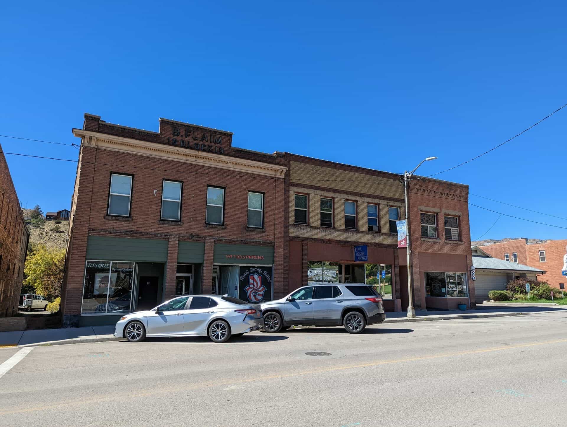 Two story red brick commercial building, originally owned Baptist Flaim. The second story of this building was the Idaho Hotel which was operated by Francis Romero in 1932. The downstairs LHS had the Helper Chop Suey House, which was operated by W.T. Hayakawn. Building is on the site of the Flaim home which burned in 1919. A beauty shop and a professional office now occupy the first floor, the second floor appears vacant. The first floor front facade has been modified. The tin cornice and block name on the second floor facade remain unaltered.