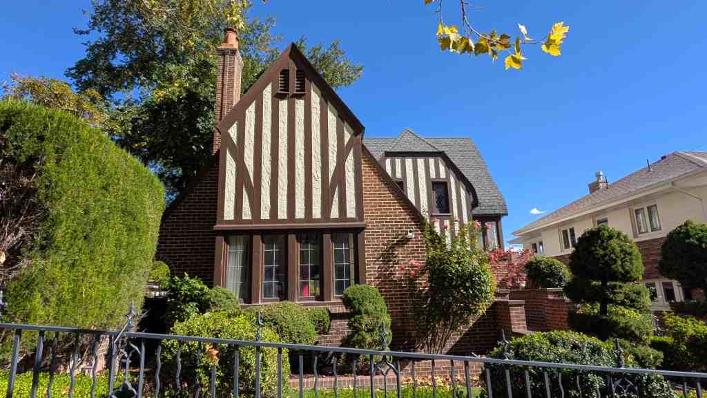 The home of Willard T. Cannon is another example of the Tudor Revival style. The two-and-a-half story home, built in 1918, has an asymmetrical plan. As in the Gallacher home, the multi-gabled roof has pseudo half timbering and leaded glass lights in casement windows. The dark red brick of the home merges into a containing wall and stairway leading to a side porch.