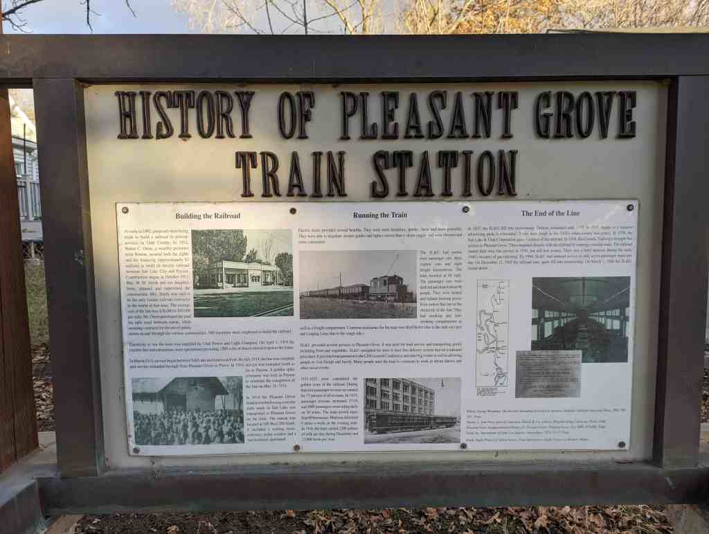 The sign from the Old Railroad Depot located at 169 West 200 South in Pleasant Grove was found and put on display here in Rose Garden Park/Pioneer Park at 107 South 100 East in Pleasant Grove, Utah