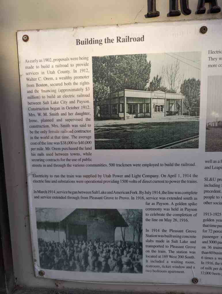 As early as 1902, proposals were being made to build a railroad to provide services in Utah County. In 1912, Walter C. Orem, a wealthy promoter from Boston, secured both the rights and the financing (approximately $3 million) to build an electric railroad between Salt Lake City and Payson. Construction began in October 1912. Mrs. W. M. Smith and her daughter, Irene, planned and supervised the construction. Mrs. Smith was said to be the only female railroad contractor in the world at that time. The average cost of the line was $38,000 to $40,000 per mile. Mr. Orem purchased the land his rails used between towns, while securing contracts for the use of public streets in and through the various communities. 500 trackmen were employed to build the railroad.