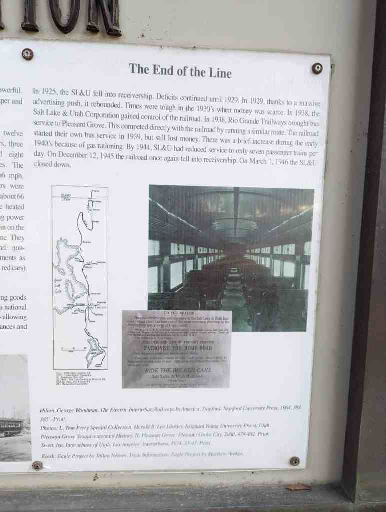 In 1925, the SL&U fell into receivership. Deficits continued until 1929. In 1929, thanks to a massive advertising push, it rebounded. Times were tough in the 1930’s when money was scarce. In 1938, the Salt Lake & Utah Corporation gained control of the railroad. In 1938, Rio Grande Trailways brought bus service to Pleasant Grove. This competed directly with the railroad by running a similar route. The railroad started their own bus service in 1939, but still lost money. There was a brief increase during the early 1940’s because of gas rationing. By 1944, SL&U had reduced service to only seven passenger trains per day. On December 12, 1945 the railroad once again fell into receivership. On March 1, 1946 the SL&U closed down.
