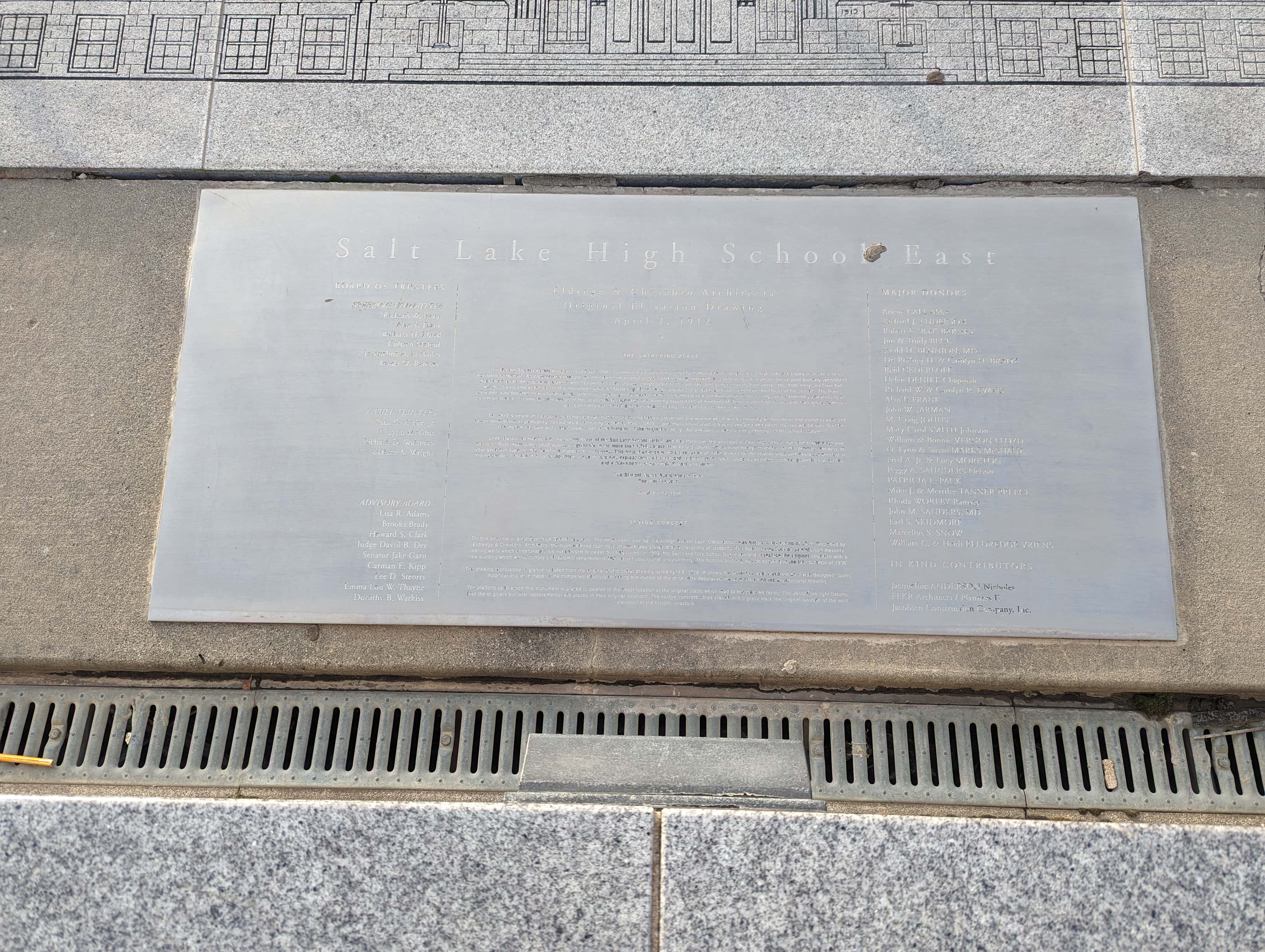 SAAE thanks the members of the School Board of the Salt Lake School District and Kay Peterson, the principal of East High School: for their cooperation and Support. Most importantly, SAAE expresses gratitude to the more than 1,200 donors from 41 U.S. States and several foreign countries for this project. Because of your generous support, this Gathering Place is memorialized. This project expresses the appreciation of these donors for the relationships and memories created at this institution. Through this Gathering Place, these donors also express their unity with and enthusiasm for future students and their continuing tradition of success and achievements at East High School and beyond.