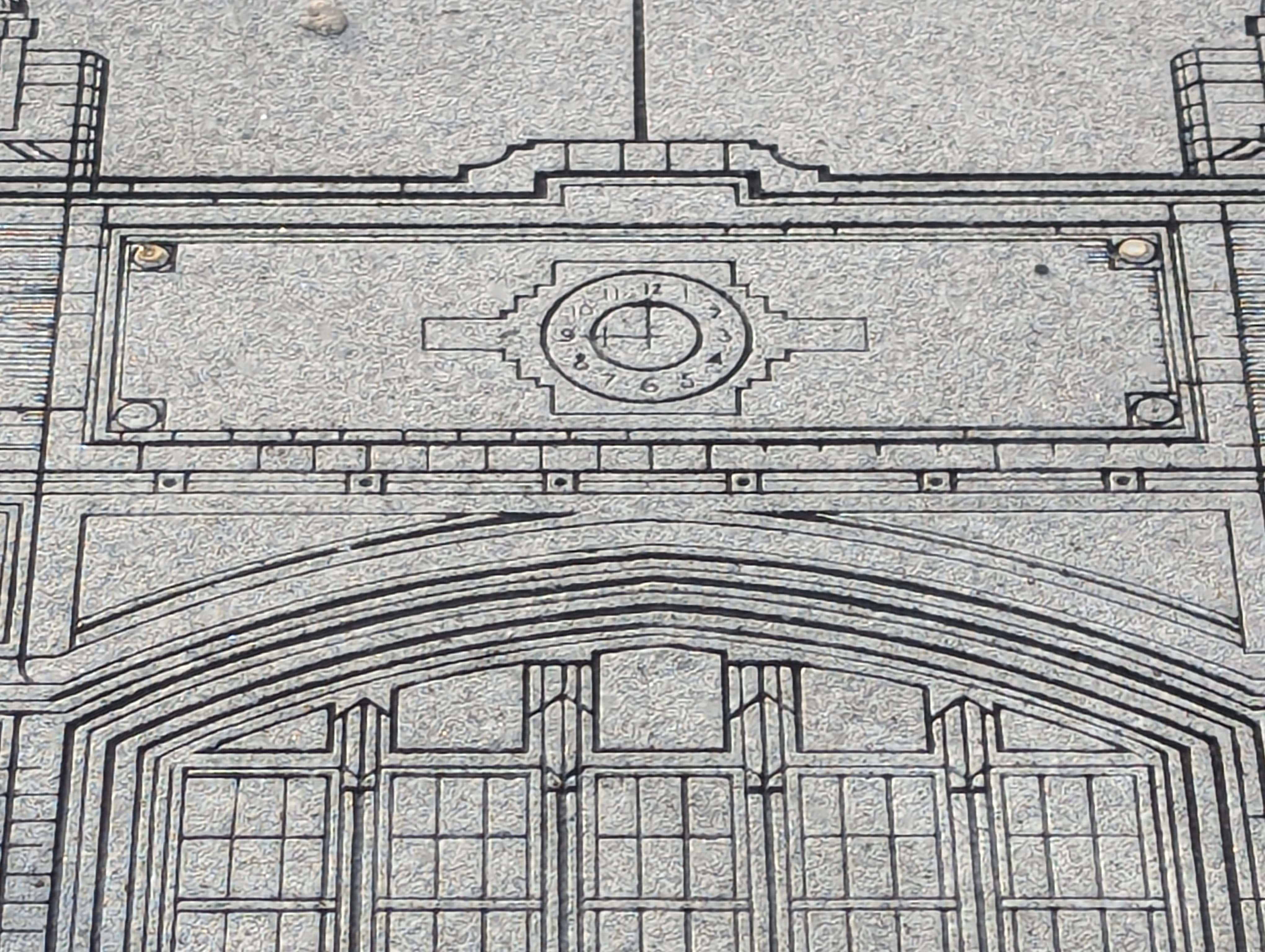 The drawing reproduced in granite is taken from the original architectural drawing dated April 2, 1912. It shows the building’s east elevation as it was designed. Some modifications were made to the completed structure including elimination of the terra cotta decorative features shown on the architectural drawing.