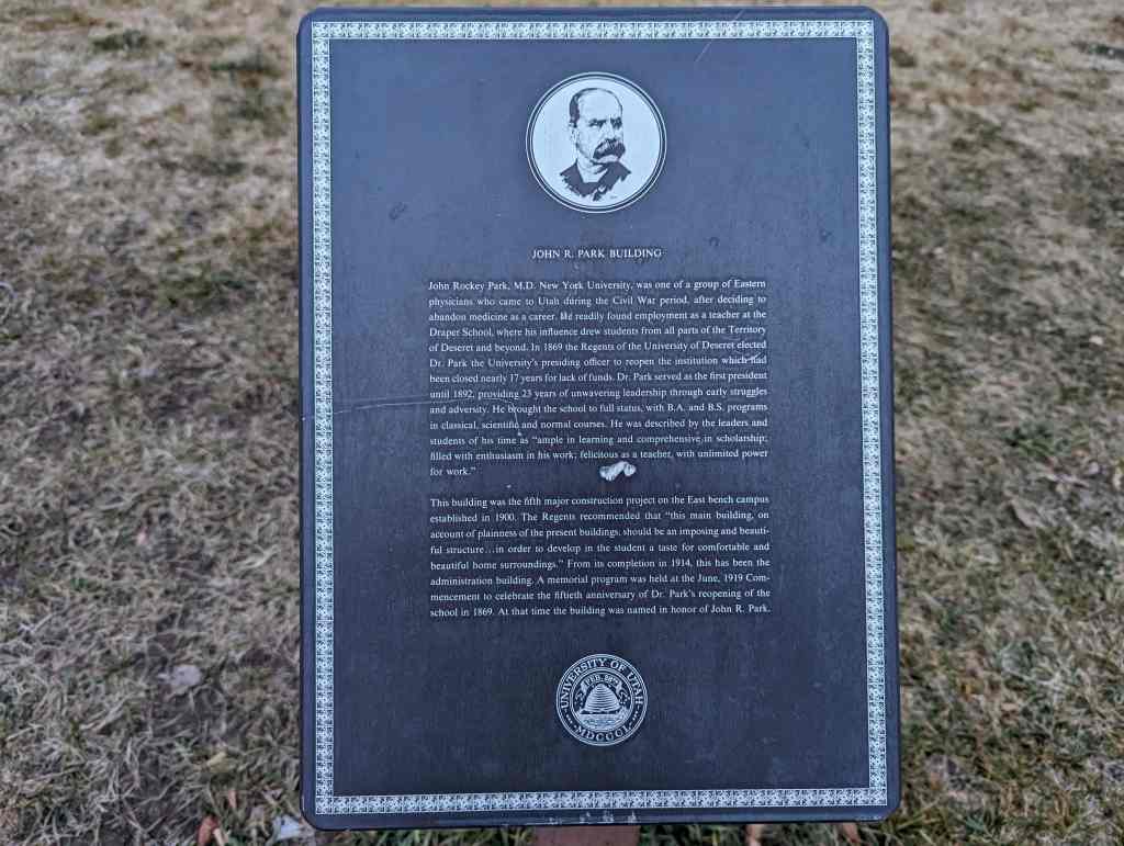 This building was the fifth major construction project on the East bench campus established in 1900. The Regents recommended that “this main building, on account of plainness of the present buildings, should be an imposing and beautiful structure…in order to develop in the student a taste for comfortable and beautiful home surroundings.” From its completion in 1914, this has been the administration building. A memorial program was held at the June, 1919 Commencement to celebrate the fiftieth anniversary of Dr. Park’s reopening of the school in 1869. At that time the building was named in honor of John R. Park.