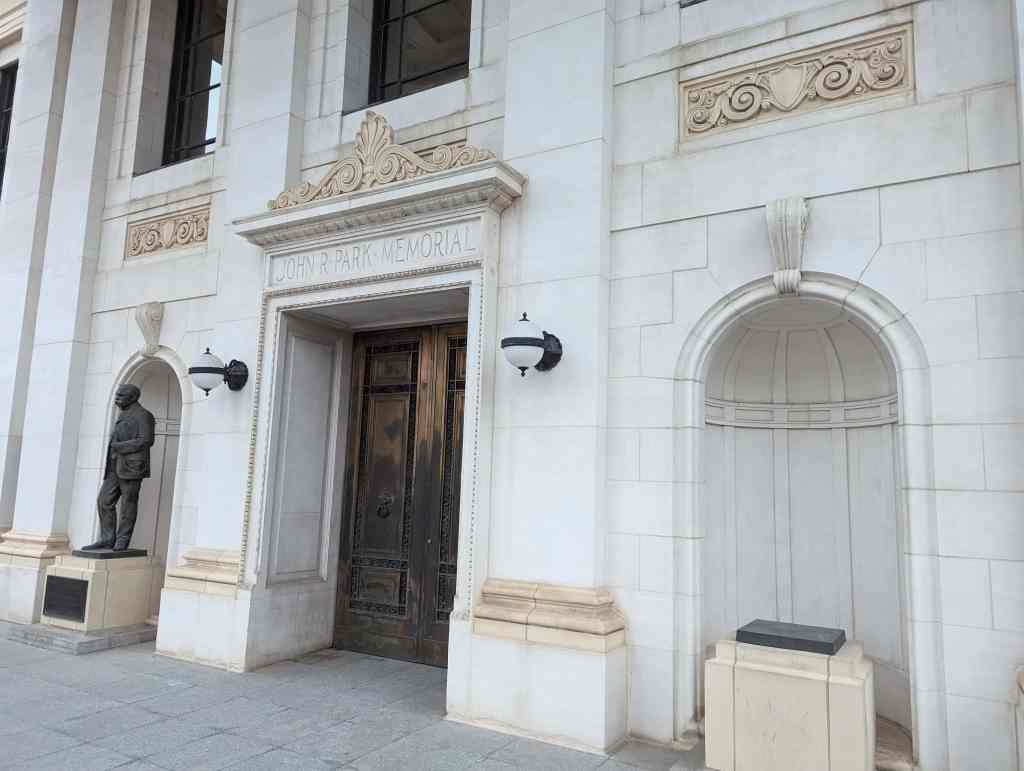 This statue of John R. Park is at the entrance to the building with a plaque that states:
