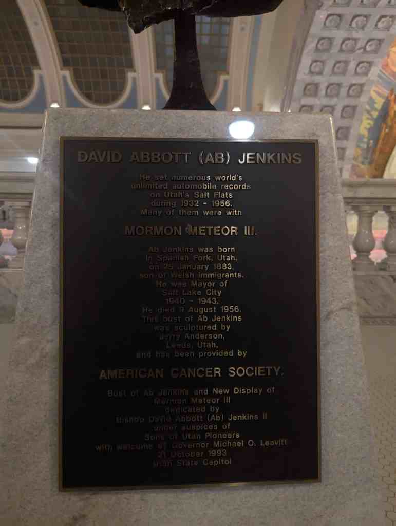 He died 9 August 1956. This bust of Ab Jenkins was sculptured by Jerry Anderson, Leeds, Utah,
