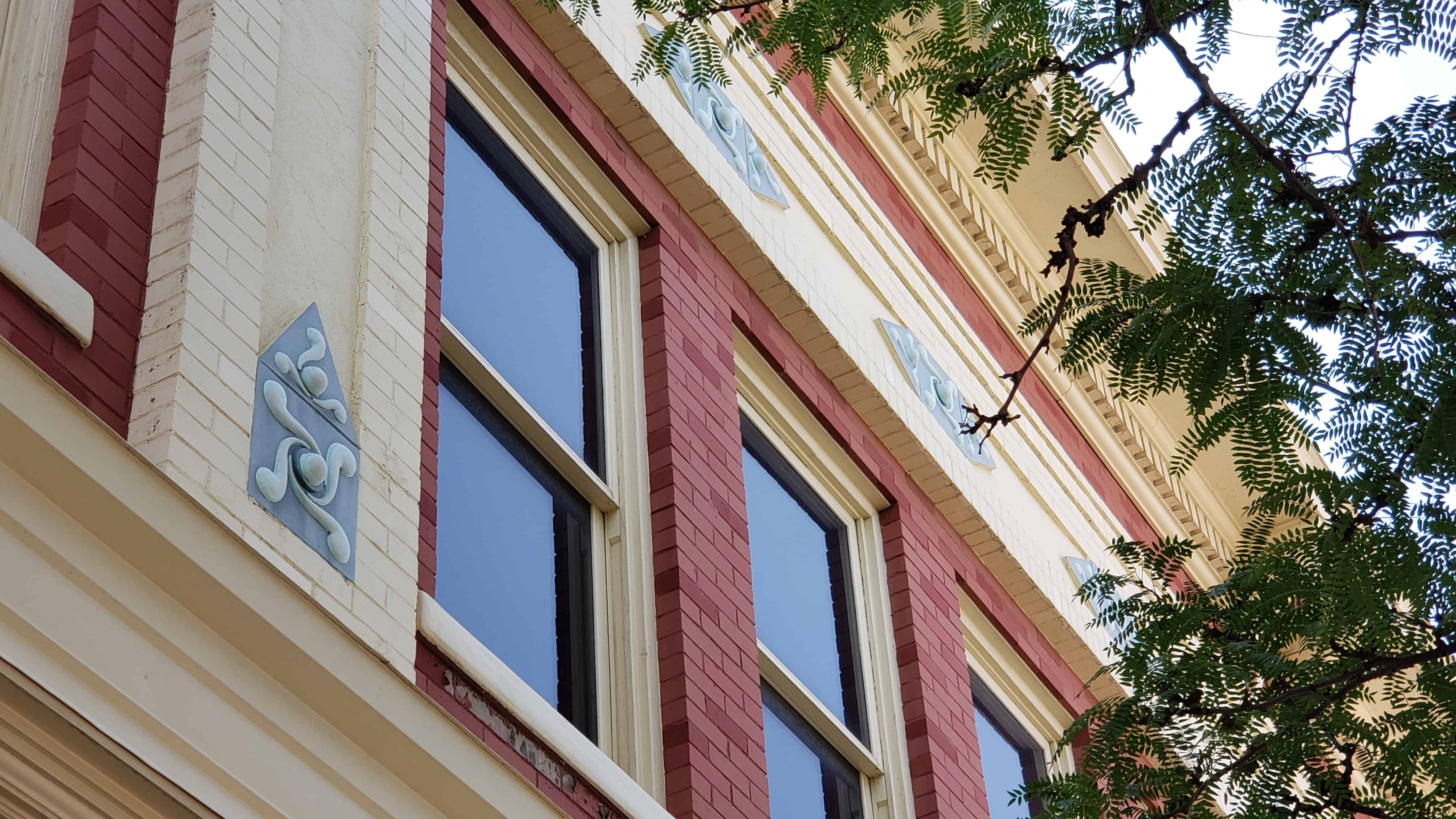 The windows on the second story are the double hung sash type. Across the façade they are grouped so that four windows are centered between two pairs of windows. Down the north side of the building there are two windows per bay. The windows are set into a darker brick and the bays are outlined and divided by bands of a light color brick. Within the panel above the windows and separating the bays, defined by the light color brick, are geometric decorative elements reminiscent of Prairie Style design. Above the second story windows is a projecting cornice supported by paired brackets and a line of dentils. The cornice is topped by a parapet which is outlined by a band of light colored brick and ornamented at the corners and at projecting points along the wall with a simple geometric ornament, also reminiscent of Prairie Style design.